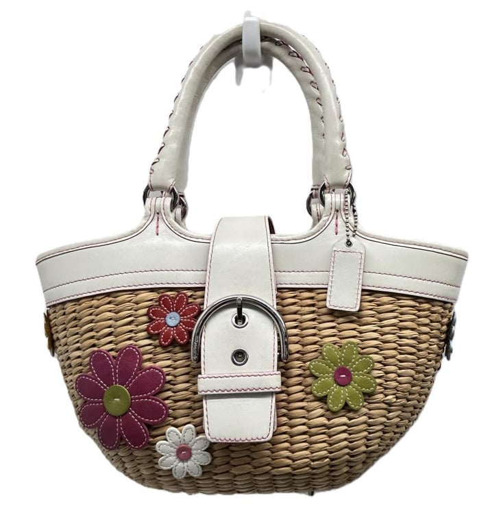 COACH 'LIMITED EDITION' CANE & LEATHER BASKET HANDBAG Embellished with multi coloured leather flowers, 2 top handles, 4 metal feet, fold over flap magnetic closure, pink logo lining, 2 slip pockets, 1 zip pocket, bag measures 34 x 21 x 10cm. 162942+36088