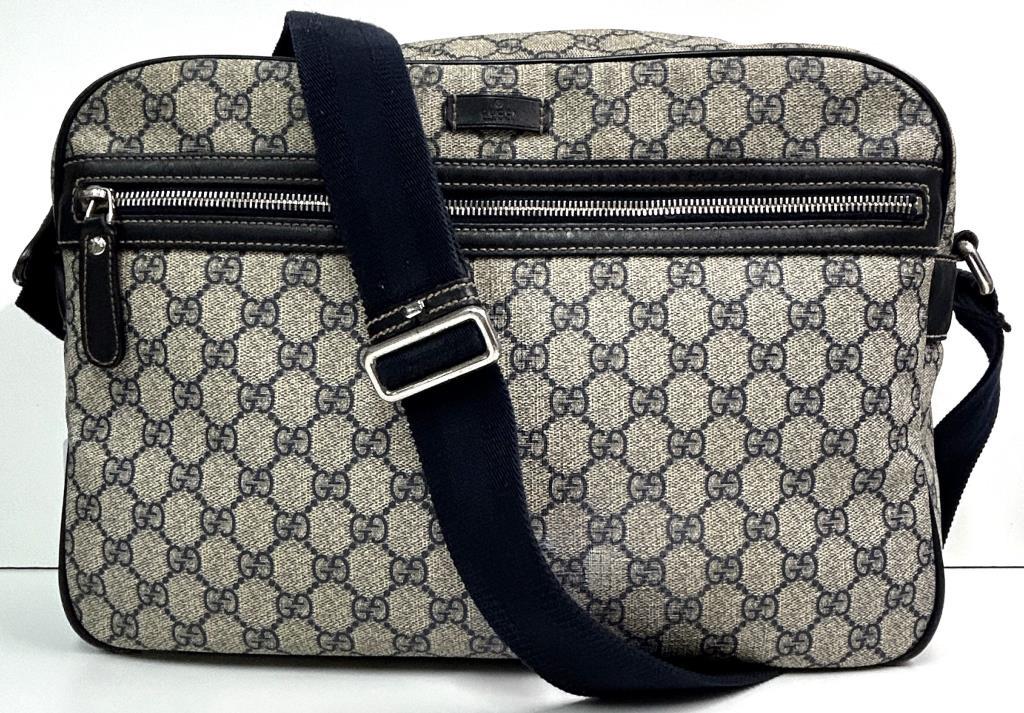 GUCCI CROSSBODY LARGE MESSENGER BAG.Monogram Coated Canvas With Black Leather Trim, Top Zip Closure, Front Long Zip Pocket, Adjustable Navy Canvas Crossbody Strap, Beige Cotton Lining With 1 Slip Pocket, Bag Measures W36Xh25Xxd11Cm, Made In Italy, Note: Marks Through-Out Lining In Bag/Pockets & Ink/Discolouration Mark Front Lower Right See Photos. Condition: Good - Refer To Images162942+33154