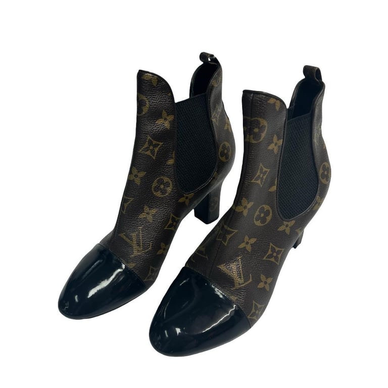 LOUIS VUITTON MONOGRAM & PATENT LEATHER ANKLE BOOTS. Elastic Sides, Heel Height 8Cm, Size 37, Made In Italy. Condition: Good - Refer To Images 162942+3