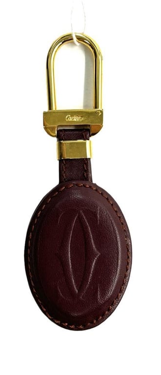 MUST DE CARTIER KEY CHAIN. Burgundy Calf Skin Leather Tag With Cartier Logo, Gold Tone Hardware, Key Chain Length 9.5Cm, Includes Original Box And Dust Cover. Condition: Good - Refer To Images 162942+32752