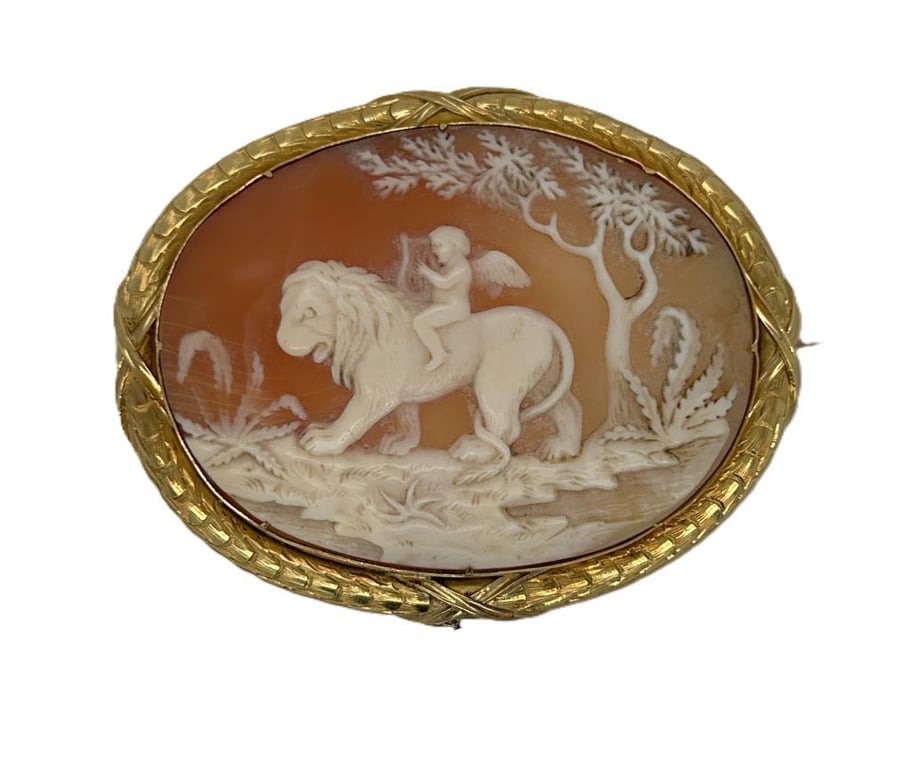 18CT YELLOW GOLD SHELL CAMEO "ANGEL/LION SCENE". Cameo Measures 5.6X4.5Cm, Xrf 18Ct Gold Test, Back Pin Closure, Total Weight 21.68 Grams. Comes With Certificate Of Authenticity. Condition: Good - Refer To Images 162942+24722