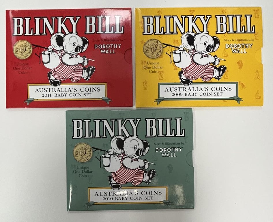 3 X 'BLINKY BILL' UNCIRCULATED BABY COIN SETS 2009/2010/2011. Unique One Dollar Coin In Each Set, Minted By The Royal Australian Mint. Condition: Good - Refer To Images 162942+27