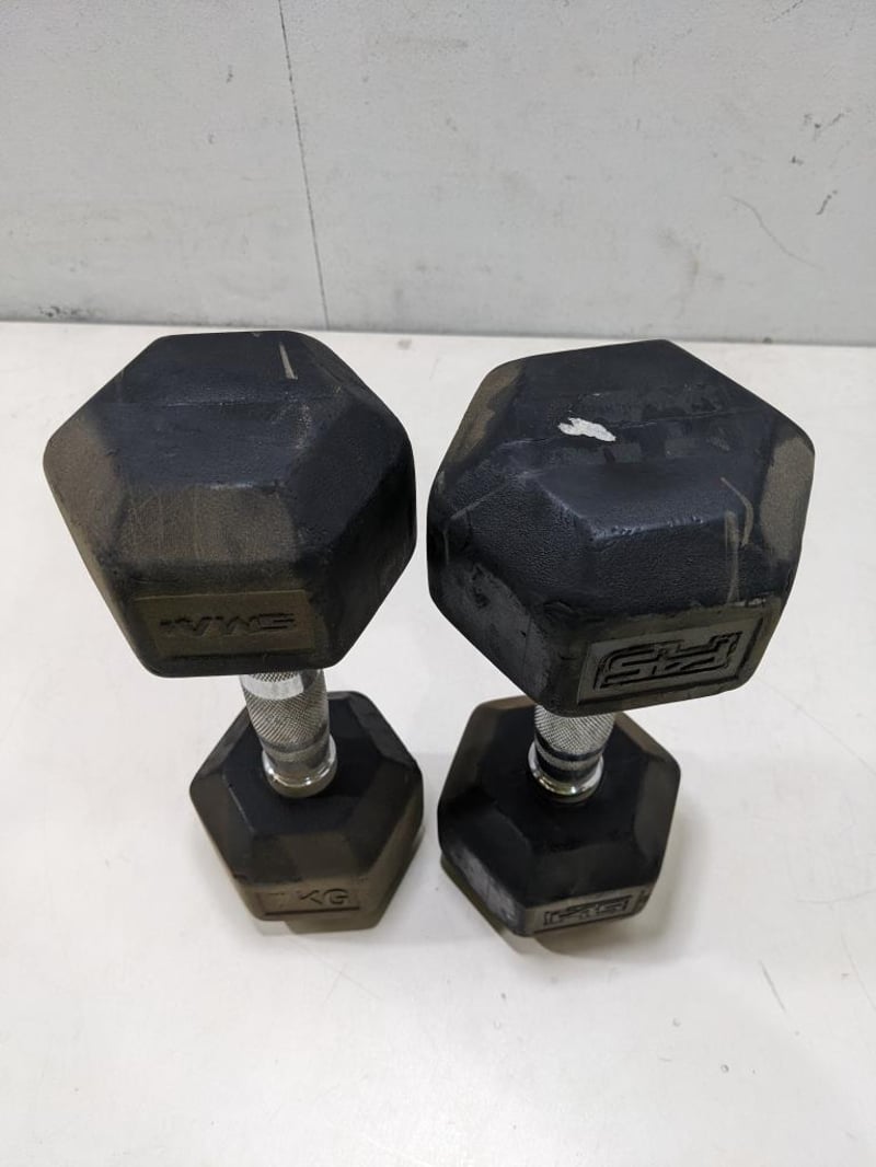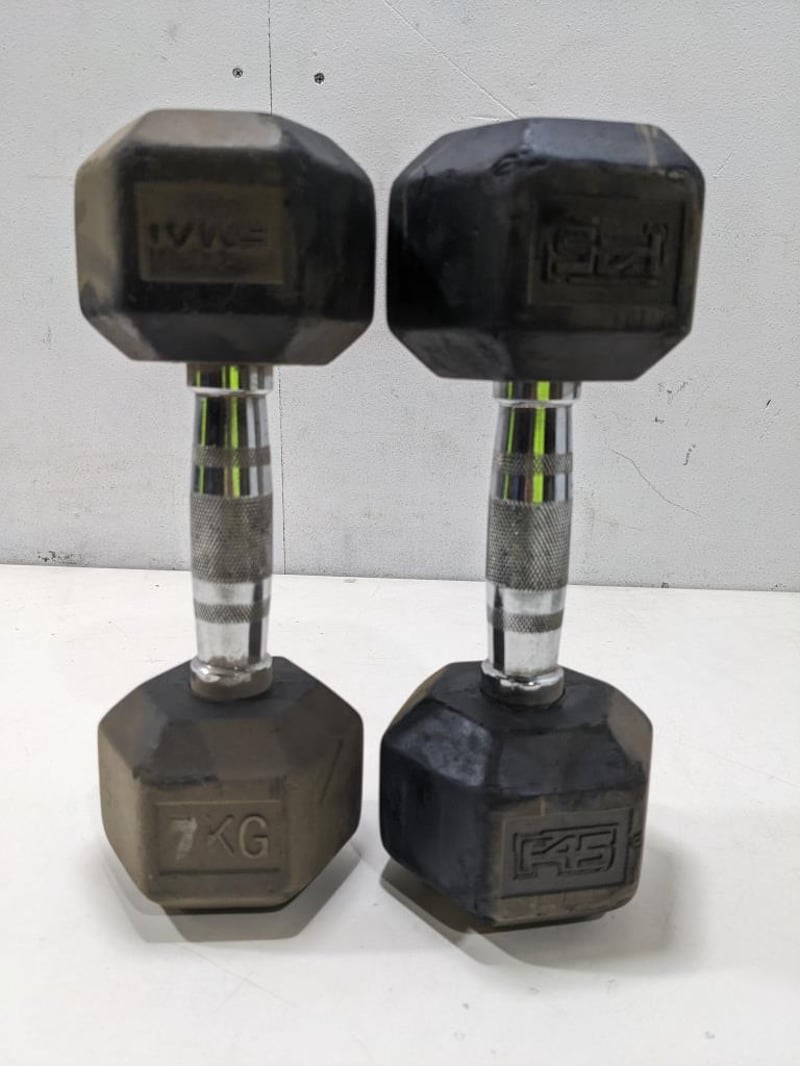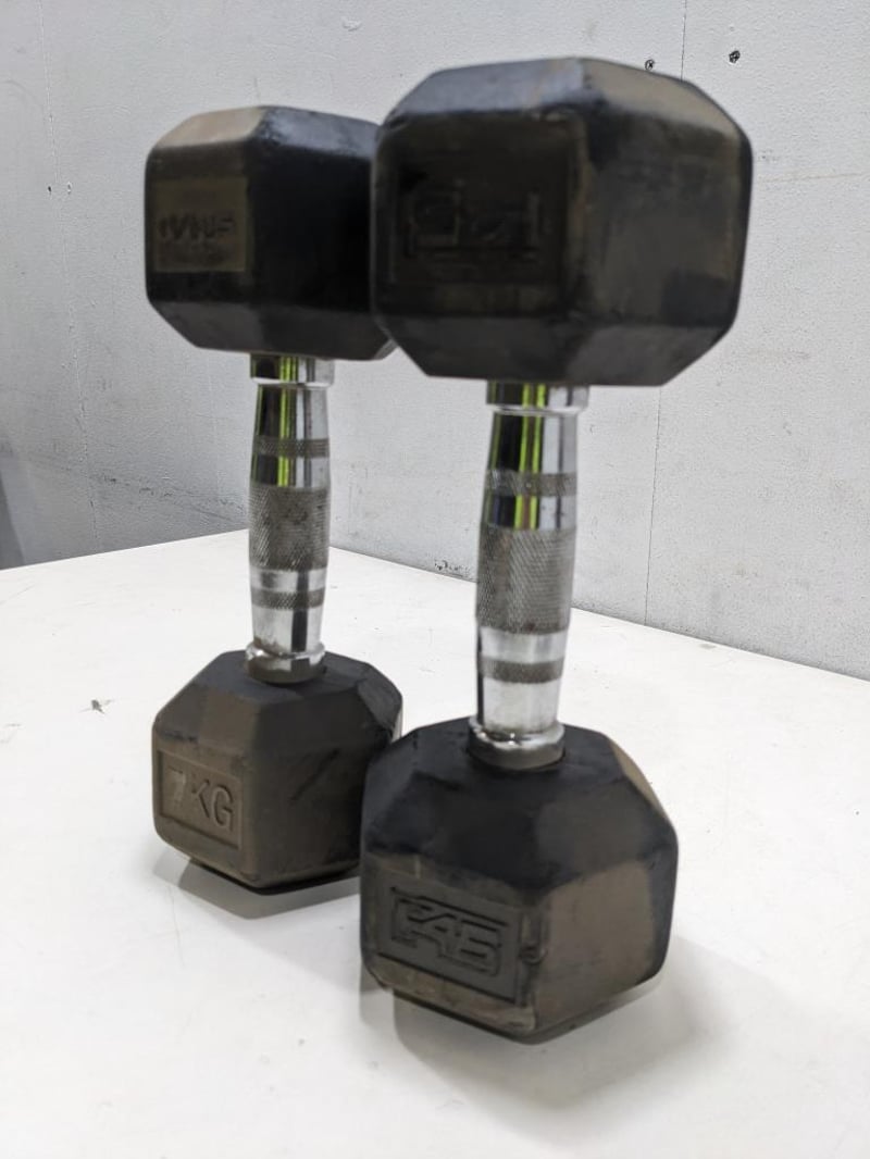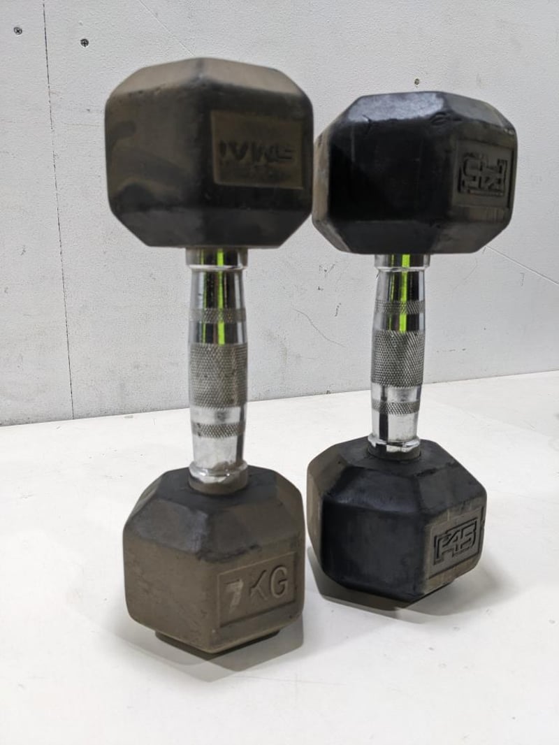 Two free weights, 7kg each. NOTE: Signs of wear and tear. Sold as a lot.