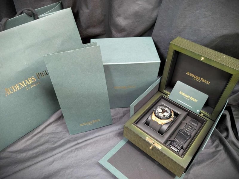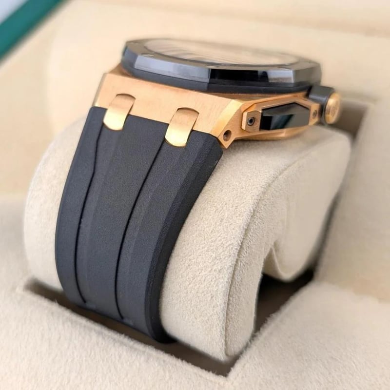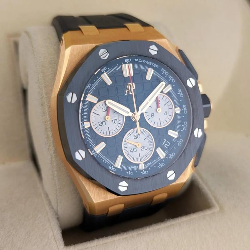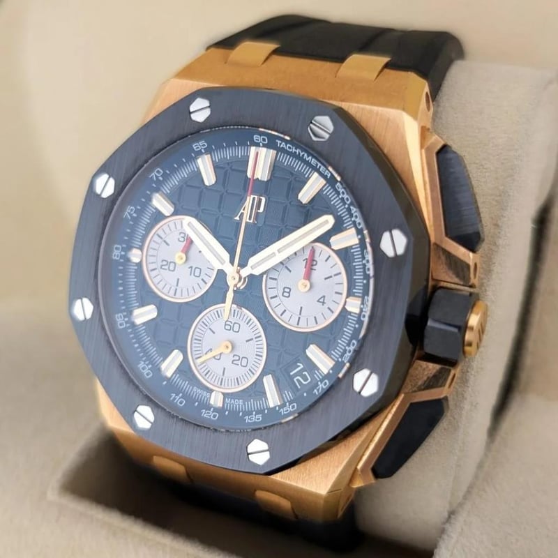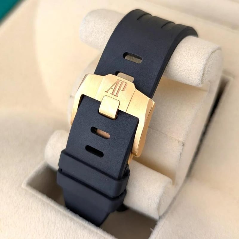 AUDEMARS PIGUET 26420RO.OO.A002CA.01 ROYAL OAK OFFSHORE 43MM 2023 BOX & PAPERS Brand: Audemars Piguet Model Number: Royal Oak Offshore Selfwinding Chronograph – 18k Red Gold, Black Méga Tapisserie Dial, on black rubber strap. Reference Number: 26420RO.OO.A002CA.01 Production Year: Circa: 2023 Dial: Black Méga Tapisserie Dial Case Size: 43mm Movement: Automatic Includes Additional Black Alligator Strap, Includes Original Sales Receipt.Box: YesPapers: Yes Condition: Good - Refer to Images 488523+15