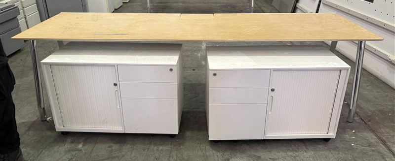 Office desk with storage cabinets. Features a long timber style desktop supported by silver metal legs and two under-desk mobile storage units. Each unit includes a lockable tambour-style sliding door compartment, two drawers, and a smaller lockable drawer.