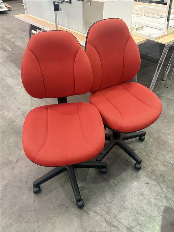 Red fabric office chairs with black plastic bases on casters.QTY 2 Sold as Lot