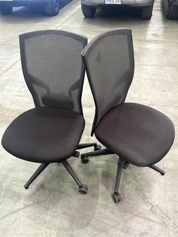 Black mesh office chairs with cushioned fabric seats.QTY 2. Missing a wheel- refer to images. Sold as Lot