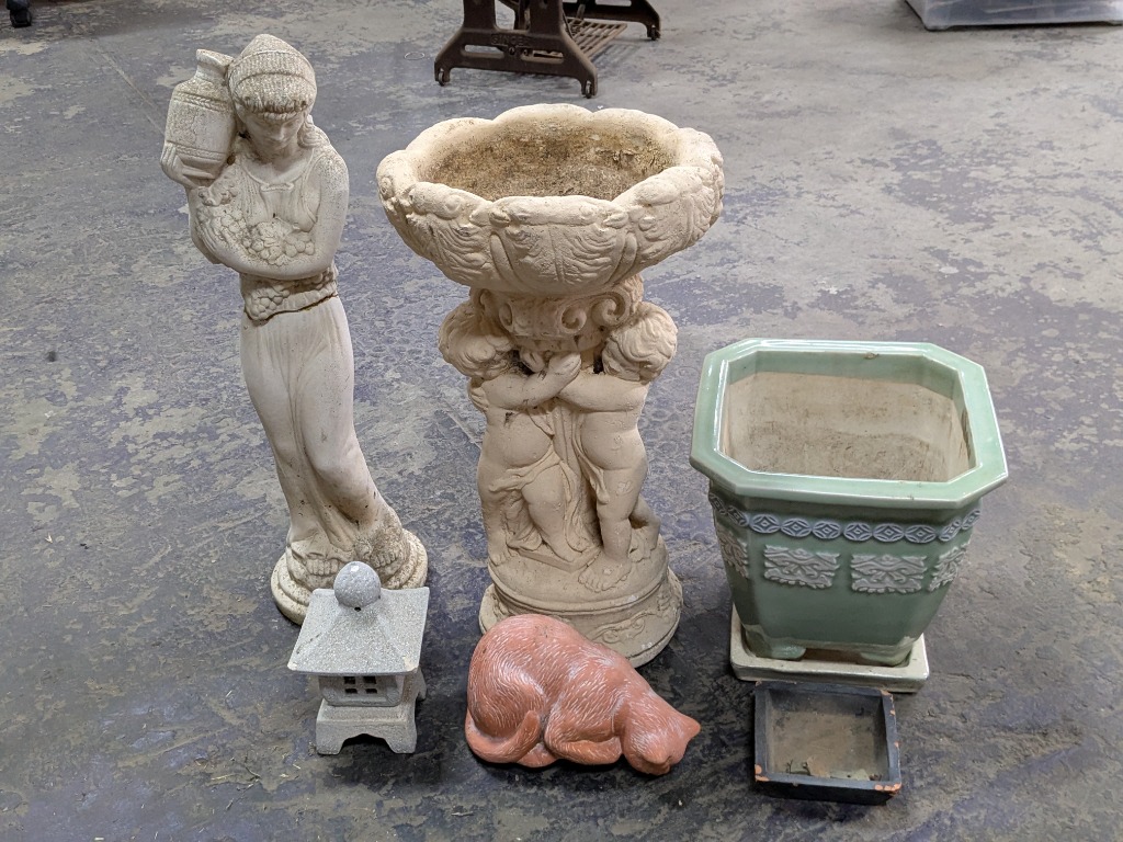 Garden ornaments, includes glazed garden pot, bird bath and more Sold as lot