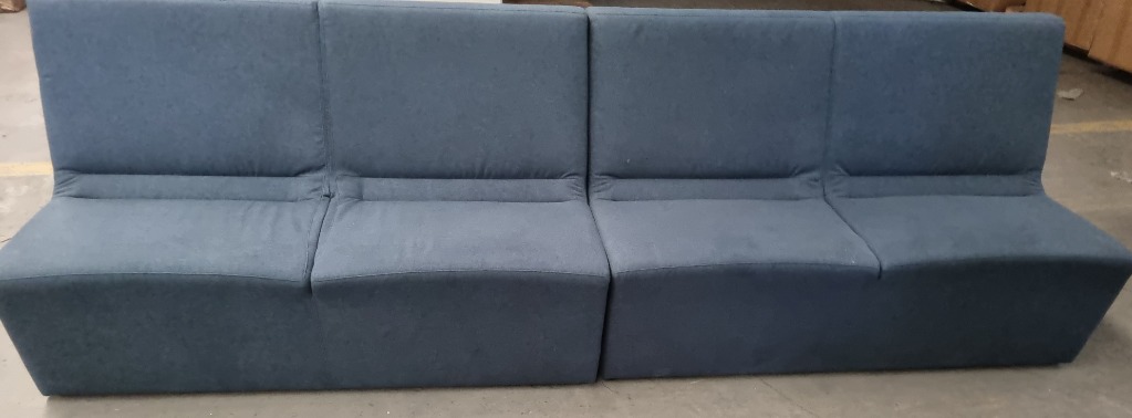 Office furniture, 2 x upholstered blue lounge suite office set. Dims: 130 x 60 x 130cmNote: some fade in upholstery