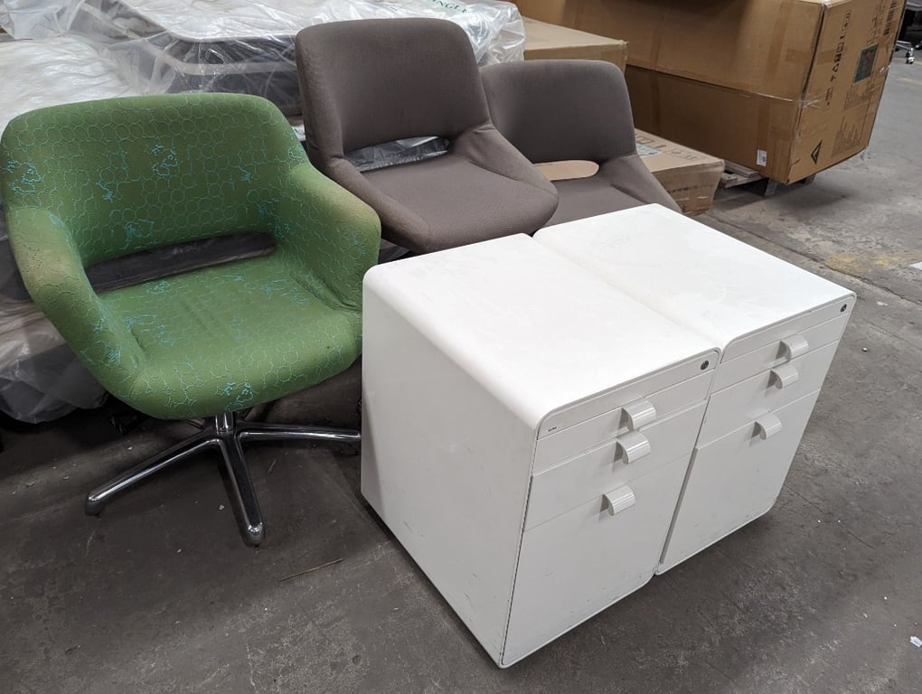 Office Furniture Lot – 2 White Filing Cabinets + 3 Office Chairs with no wheels on all 3. Note: signs of wear Sold as lot