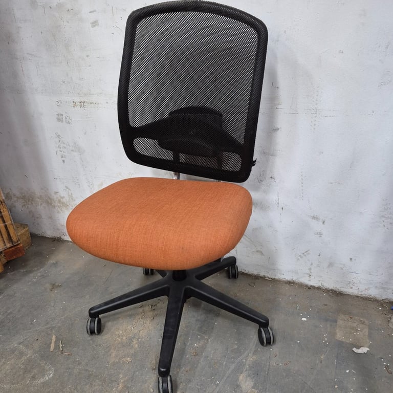 1x Office chair, Orange colour finish on seat, adjustable height lever One rip on the material of the top Dimensions: H 115cm x 58cm x 70cm