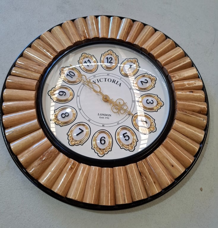 Wooden clock, Natural finish, Model: FFWCL01 Dimensions: 40 cm Diameter QTY 5 SOLD AS LOT