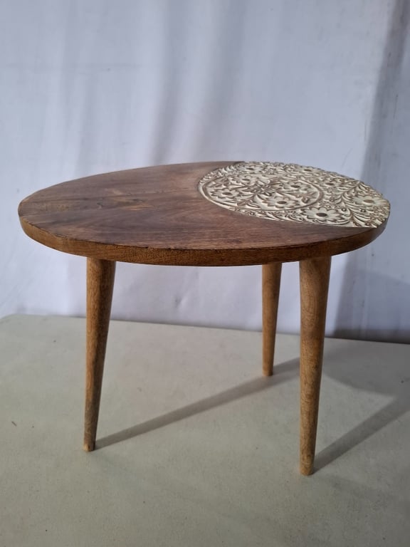 3 legs oval small timber Table with decorations, white antique colour w/ patterning, Model: FFWTB01 Dimensions: 500mm (H) x 520mm (W) x 400mm (D) BID PER EACH