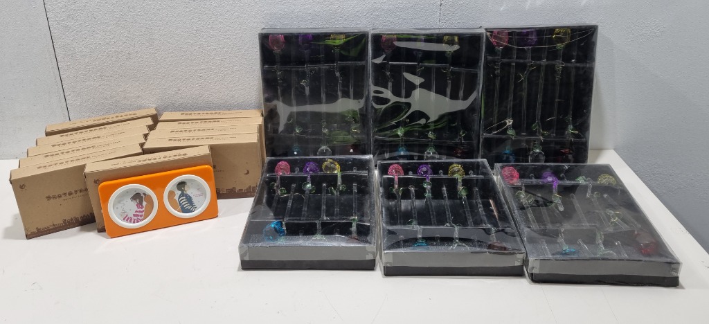 Home Decorations lot, includes photo frames and multicoloured glass stemmed roses.