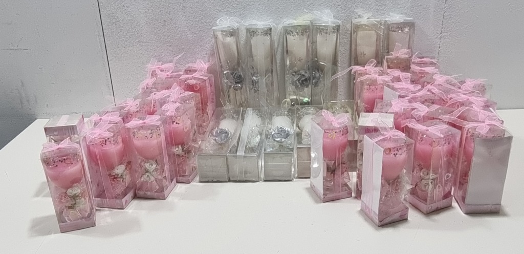 Assorted candles lot, includes candles in glassware with flowers and ribbons, white and pink. Sold as lot