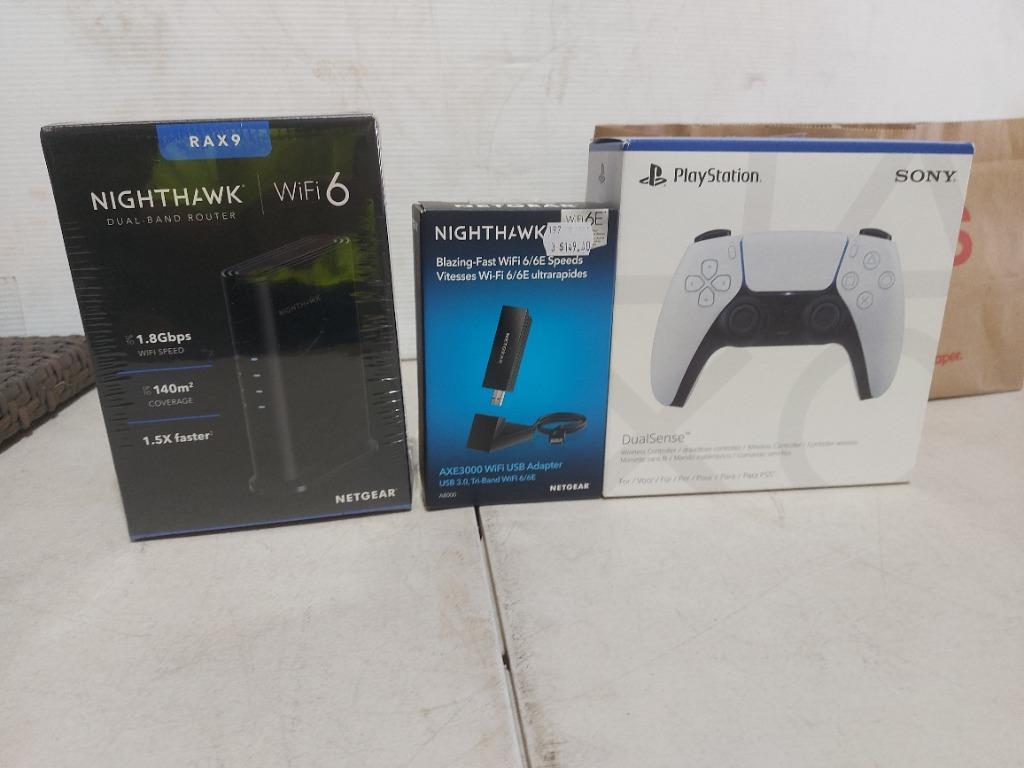 1 x NETGEAR NightHawk Wi-Fi 6, AX1800 router, RAX9, RRP$149.00, NEW factory sealed in box, 1 x NETGEAR NightHawk AXE3000 WiFi USB adapter, black A8000, RRP$149.00, NEW factory sealed in box, 1 x SONY PlayStation 5 DualSense wireless controller, RRP$124.00, NEW in box