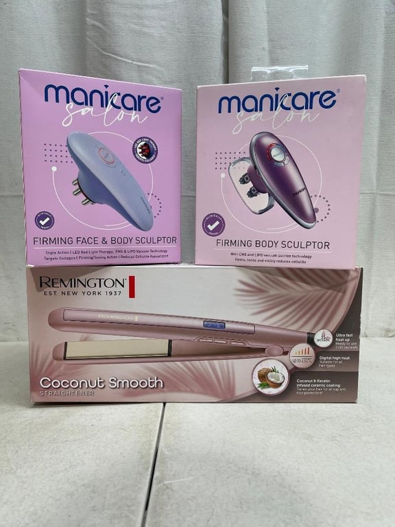 1 x MANICARE Salon Firming Face & Body Sculptor, LED red light therapy, RRP$139.99, NEW factory sealed in box, 1 x MANICURE Salon Firming Body Sculptor, with EMS & Lipo vacuum suction technology, RRP$139.99, NEW factory dealed in box, 1 x REMINGTON "Coconut Smooth" Hair straightner, NEW factory sealed in box