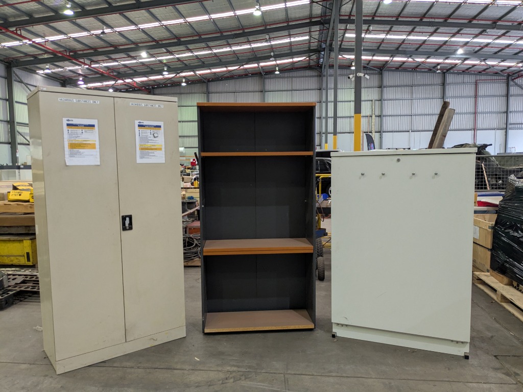 Assorted Cabinets Metal Style & Laminate Chip Board Style, Bookshelf Brown & Gray, Double Door Beige Metal Cabinet + Beige Document Hanging Storage Cabinet, Overall Size Approximately : H 183cn x W 950cm x D 440cm