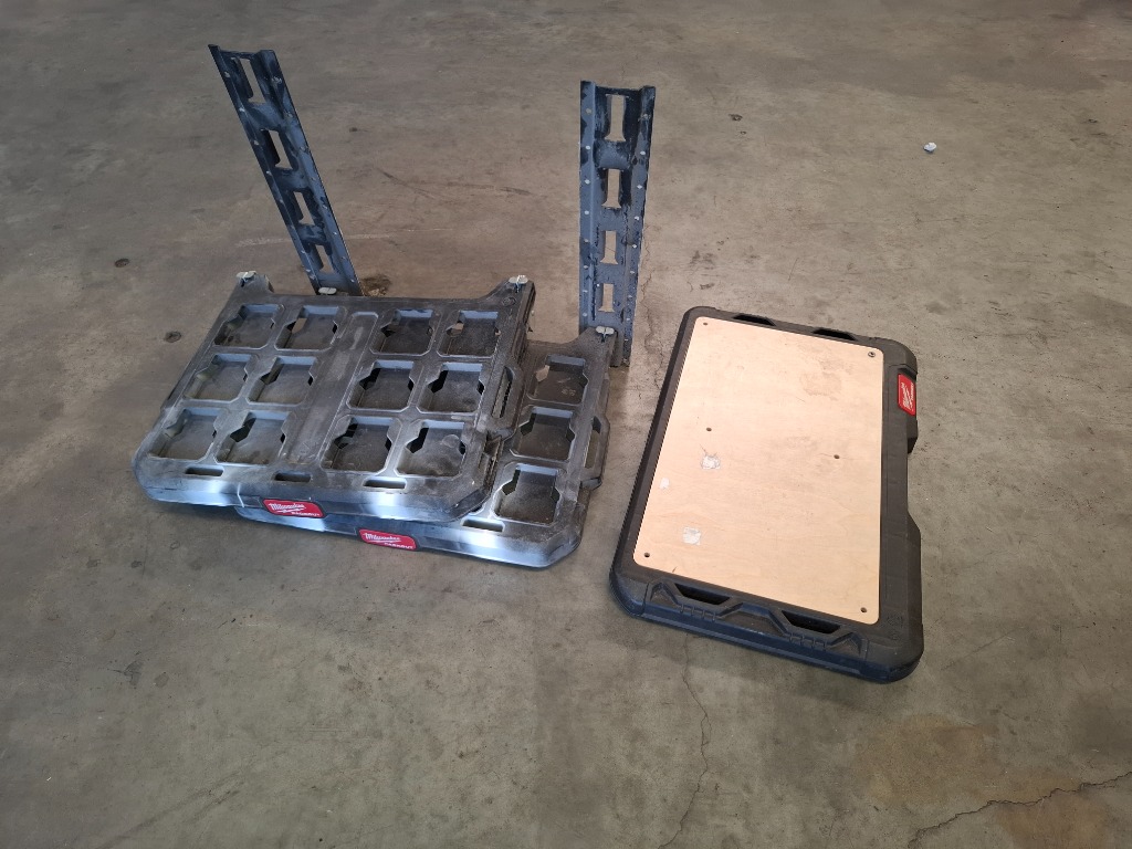 Assortment lot of Milwaukee metal wall mount with two hard plastic shelves and a wall mount plastic/timber boardSOLD AS LOT
