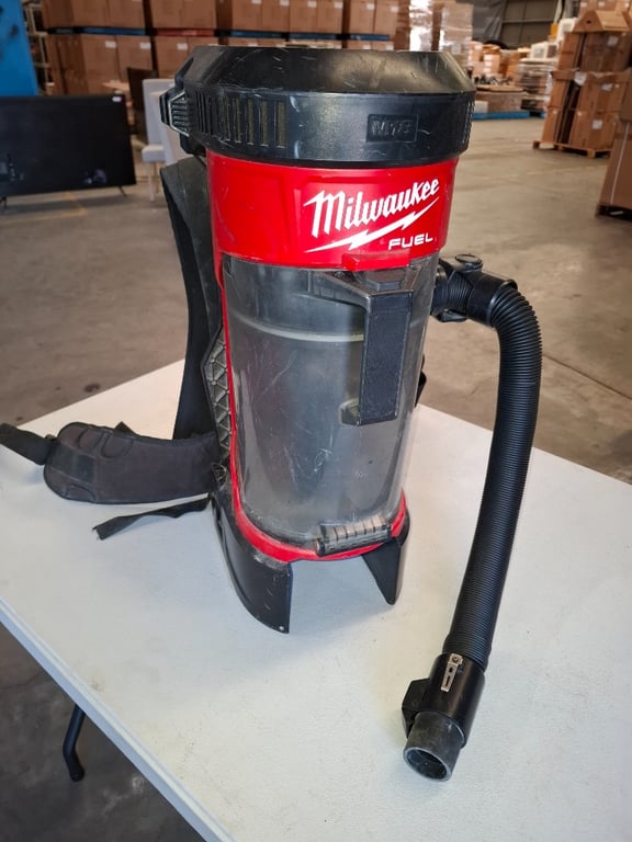 Cordless vacuum, SKIN ONLY Make: Milwaukee Model: M18FBPVVolume of air flow: 1557 L/minCapacity: 3 8 LPower: 18V-380W / M18 Li-IonWeight: 7.1 kgDescription: includes backpack holder, one articulate hose NOTE: SKIN ONLY, WORKING CONDITIONS UNKNOWN, INSPECTION RECOMMENDED
