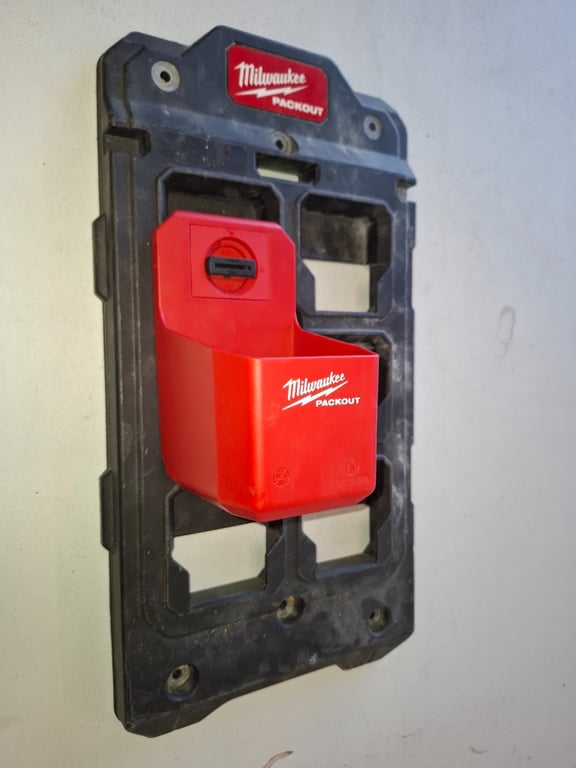 Milwaukee hard plastic wall mount 22.5 kg capacity with one storage compartment, 4.5 kg capacity red hard plastic Dimensions: 50 cm H x 26 cm W x 15 cm DNOTE: SCRATCHES, AND WEAR , CLEANING REQUIRED