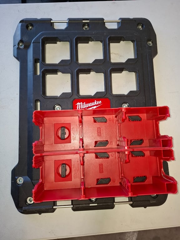 Milwaukee hard plastic wall mount with two storage compartment 9kg capacity red hard plastic Dimensions: 59 cm H x 47 cm W x 12 cm DNOTE: WEAR AND TEAR