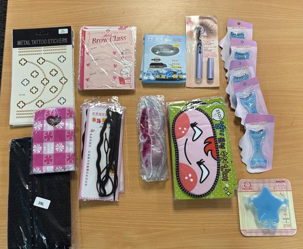 Assorted Beauty and Personal Care Items including 2XL Waist Trainer, Eyebrow Stencils, Eye Masks, and more.