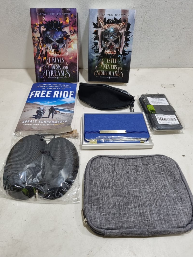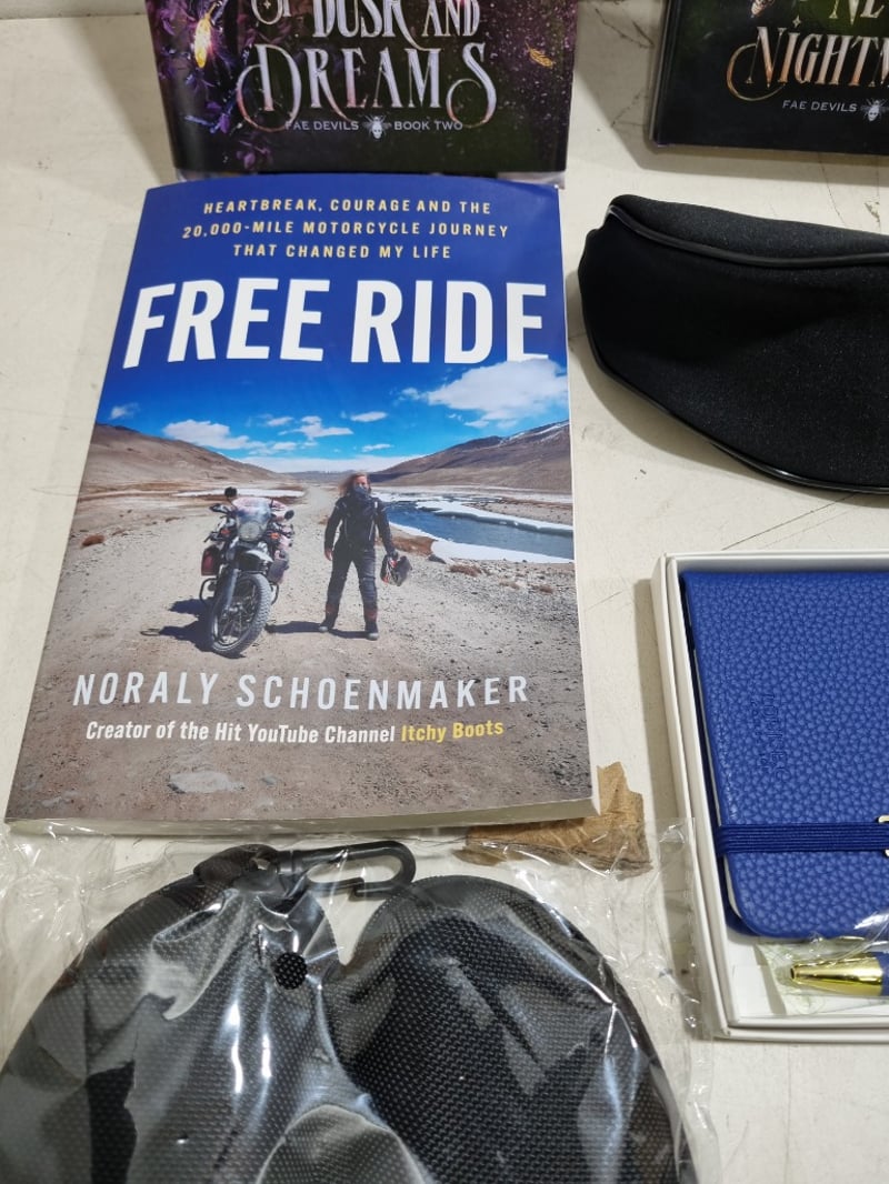 Assorted lot, includes snowledge cycling glasses, Louise.C notebook and pen set and more..... Sold as lot