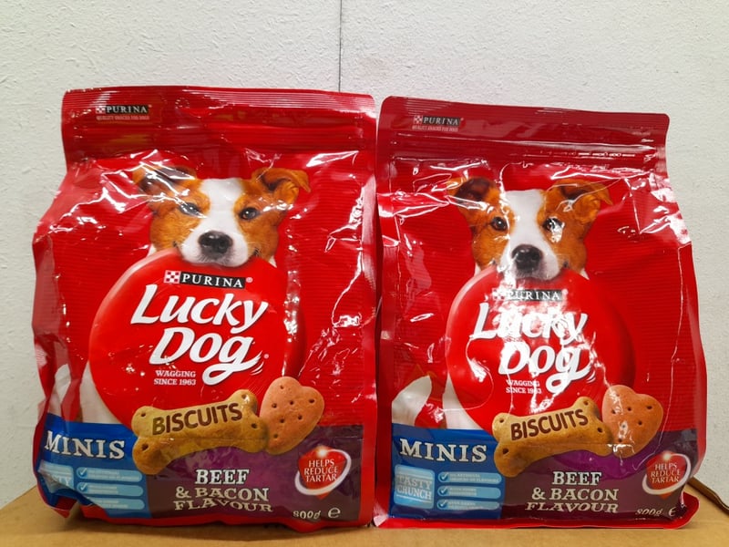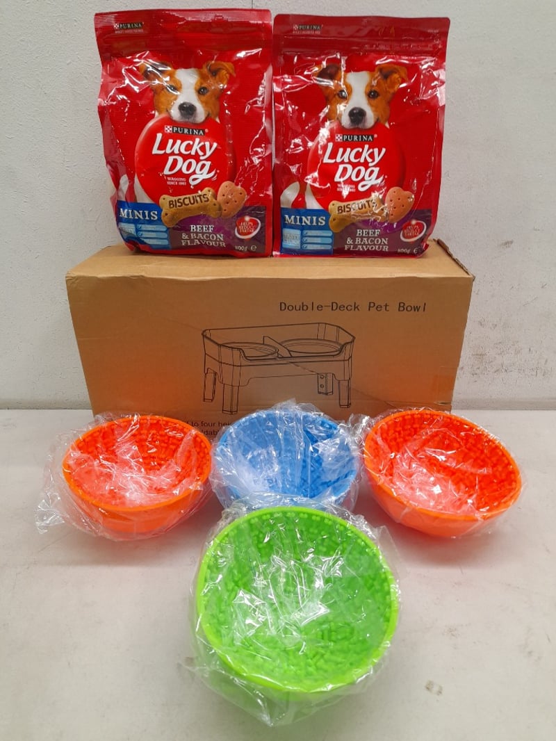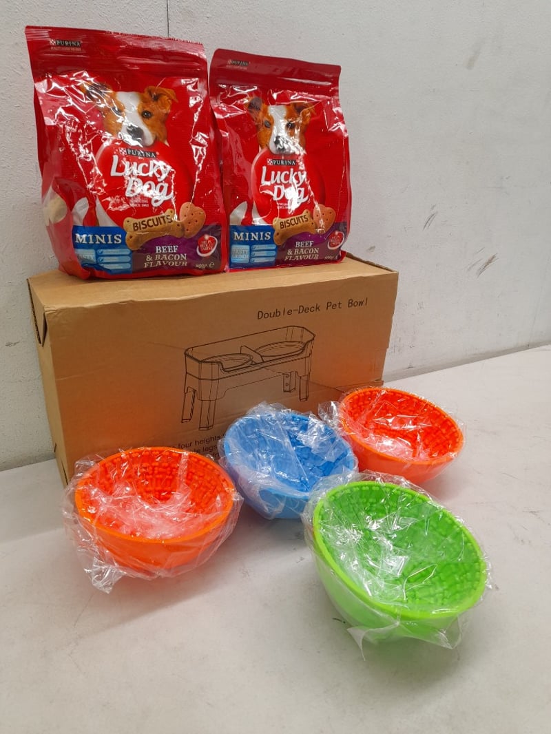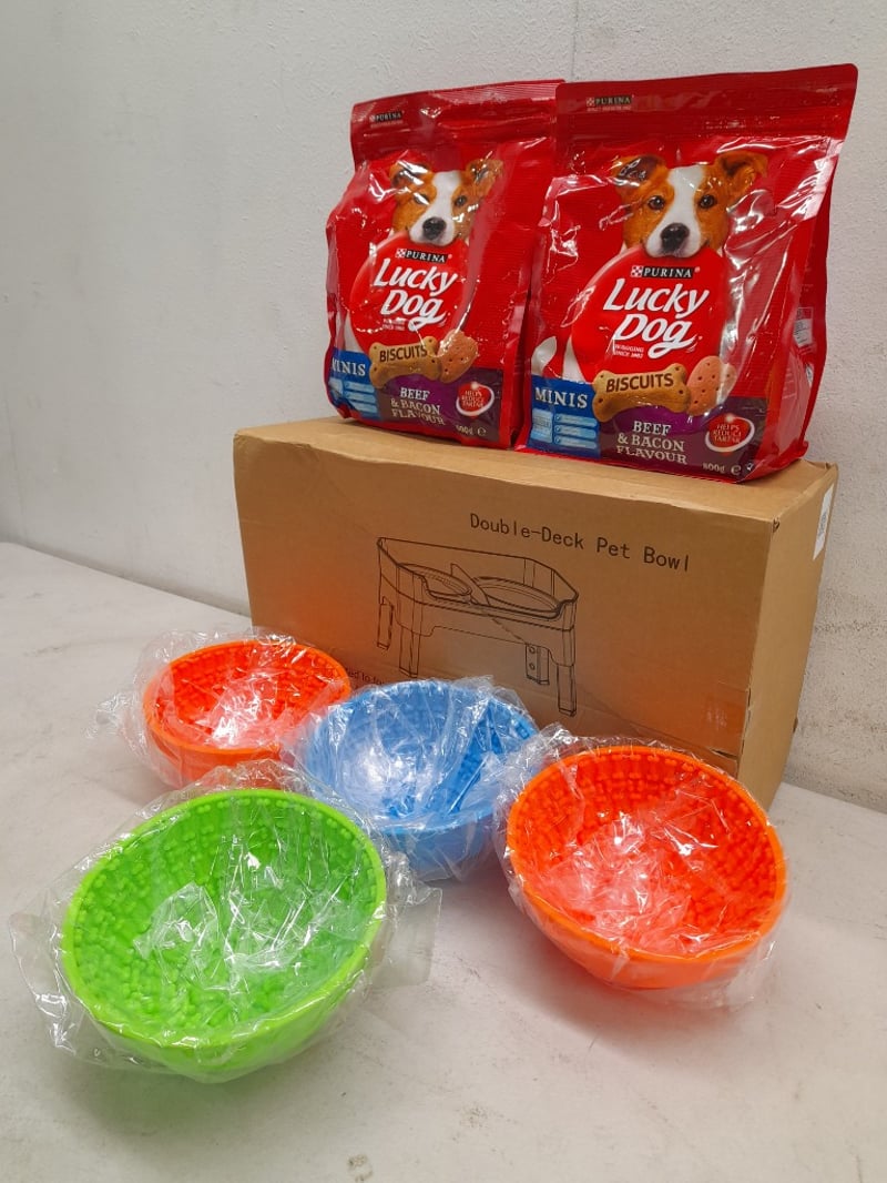 Double Deck Pet Bowl, Purina Lucky Dog Biscuits x2, Dog Toys x4