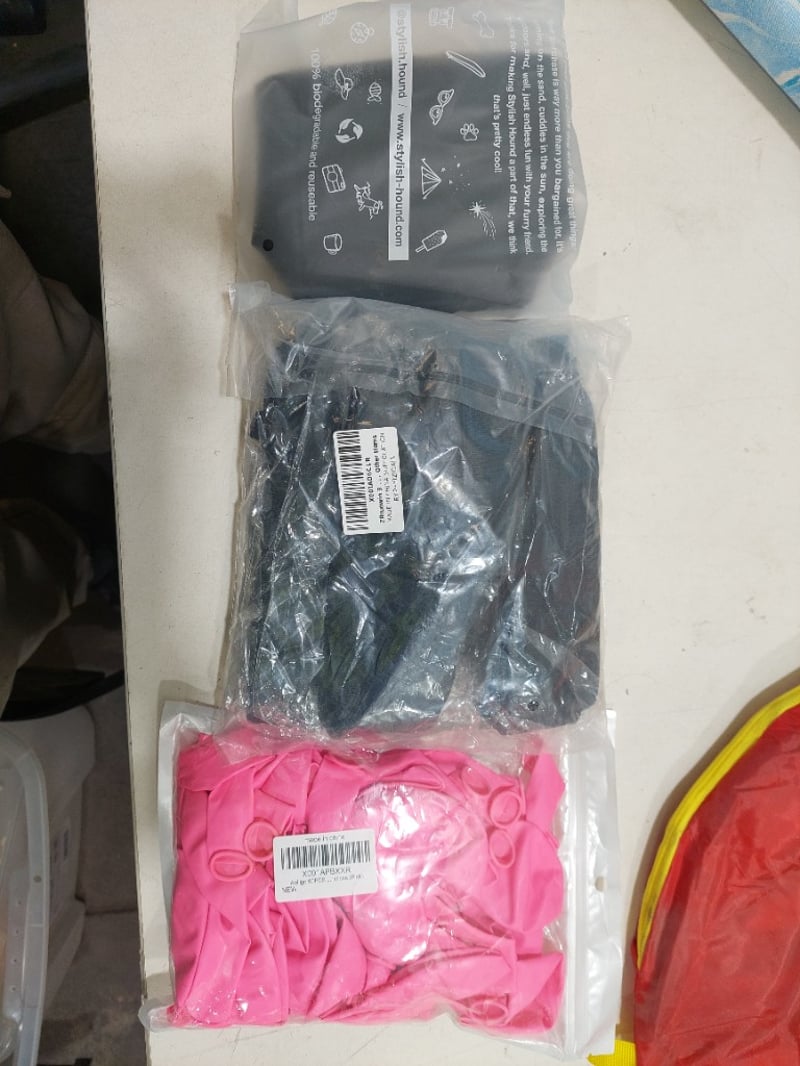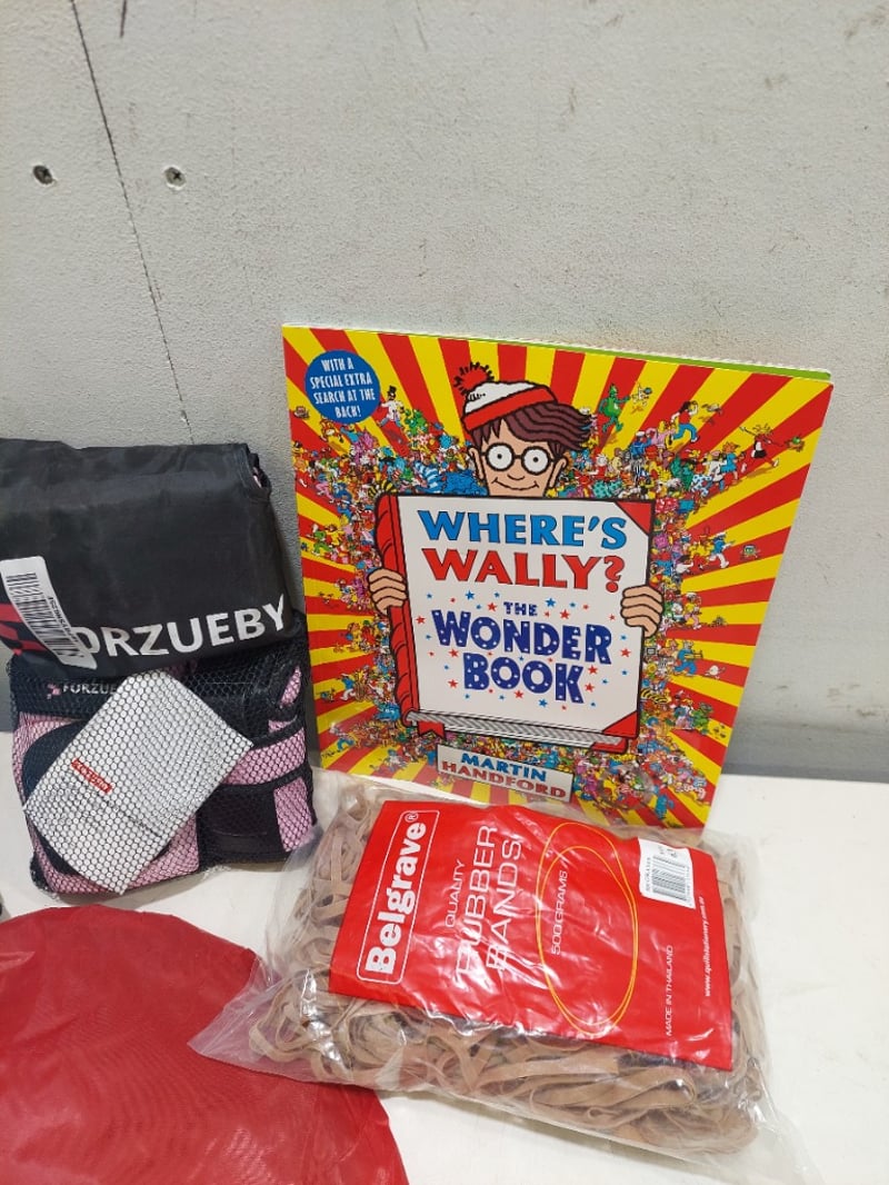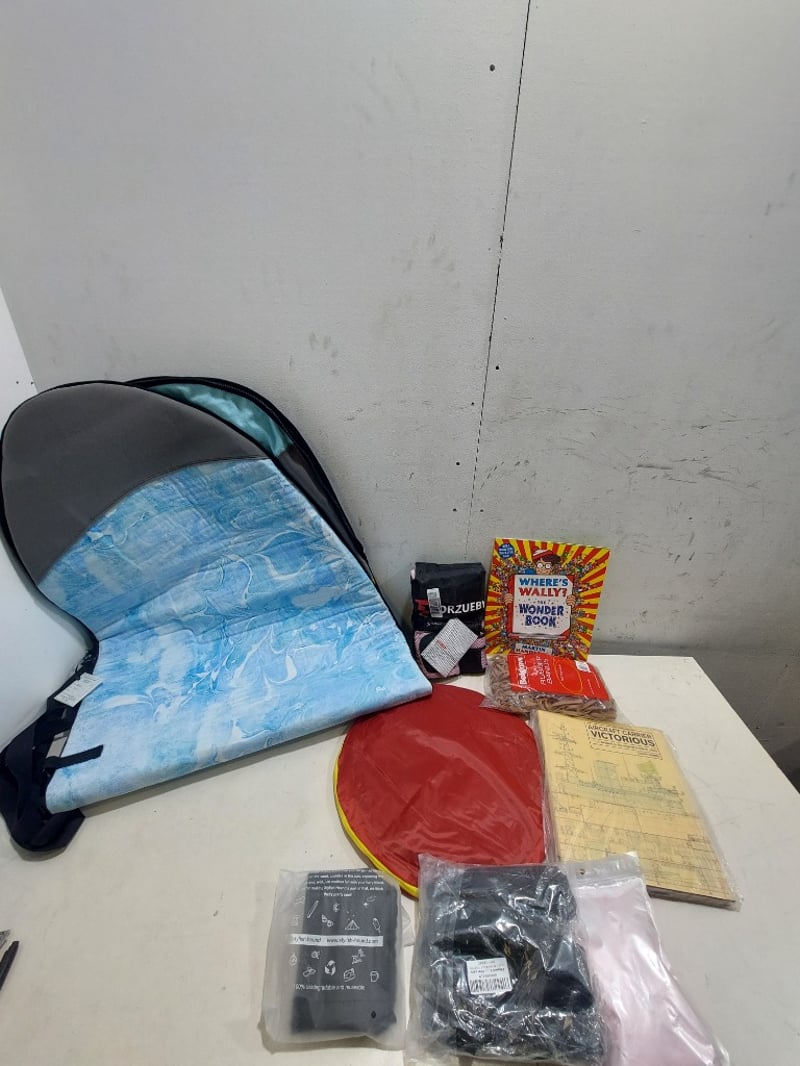 Assorted items including a surfboard cover, wheres waldo book, balloons and more.Sold as a lot.