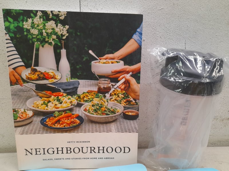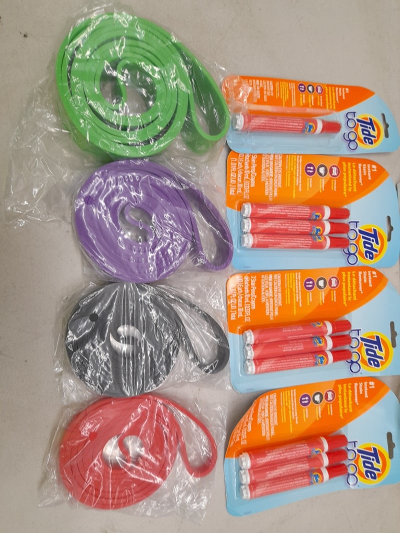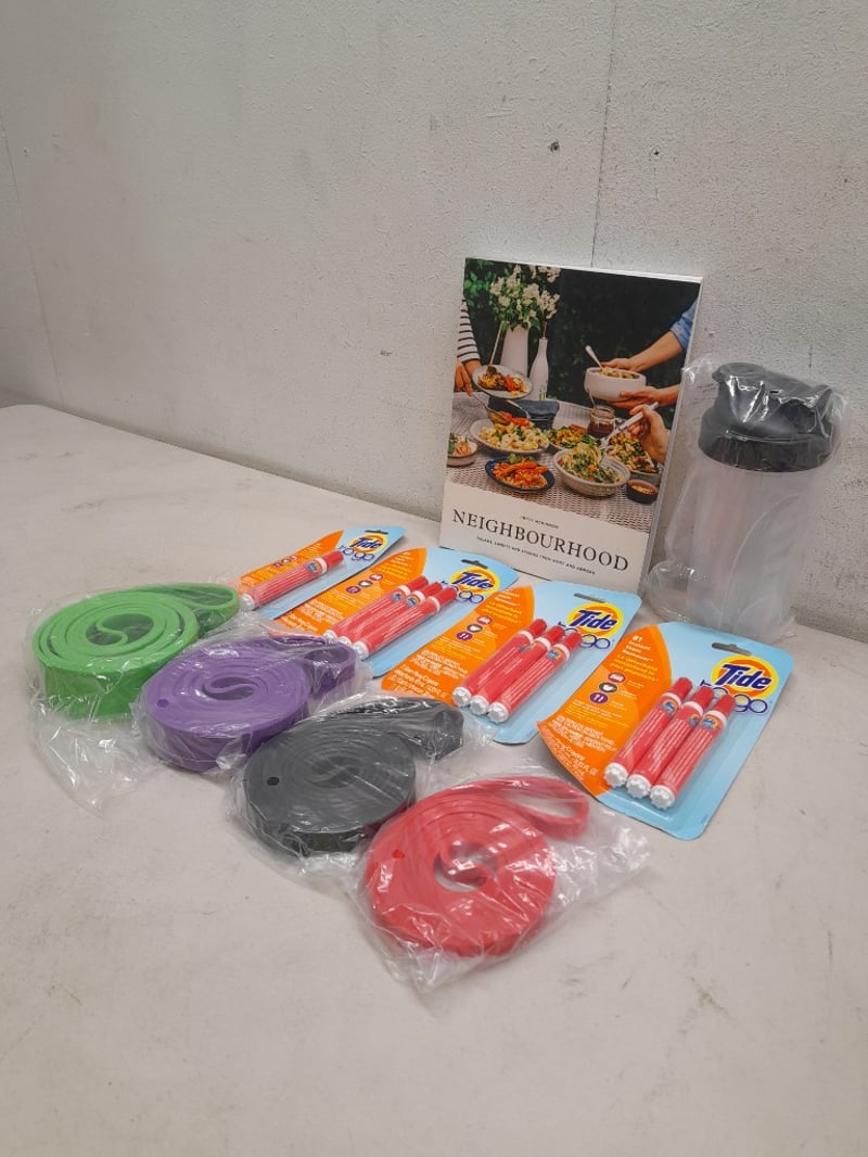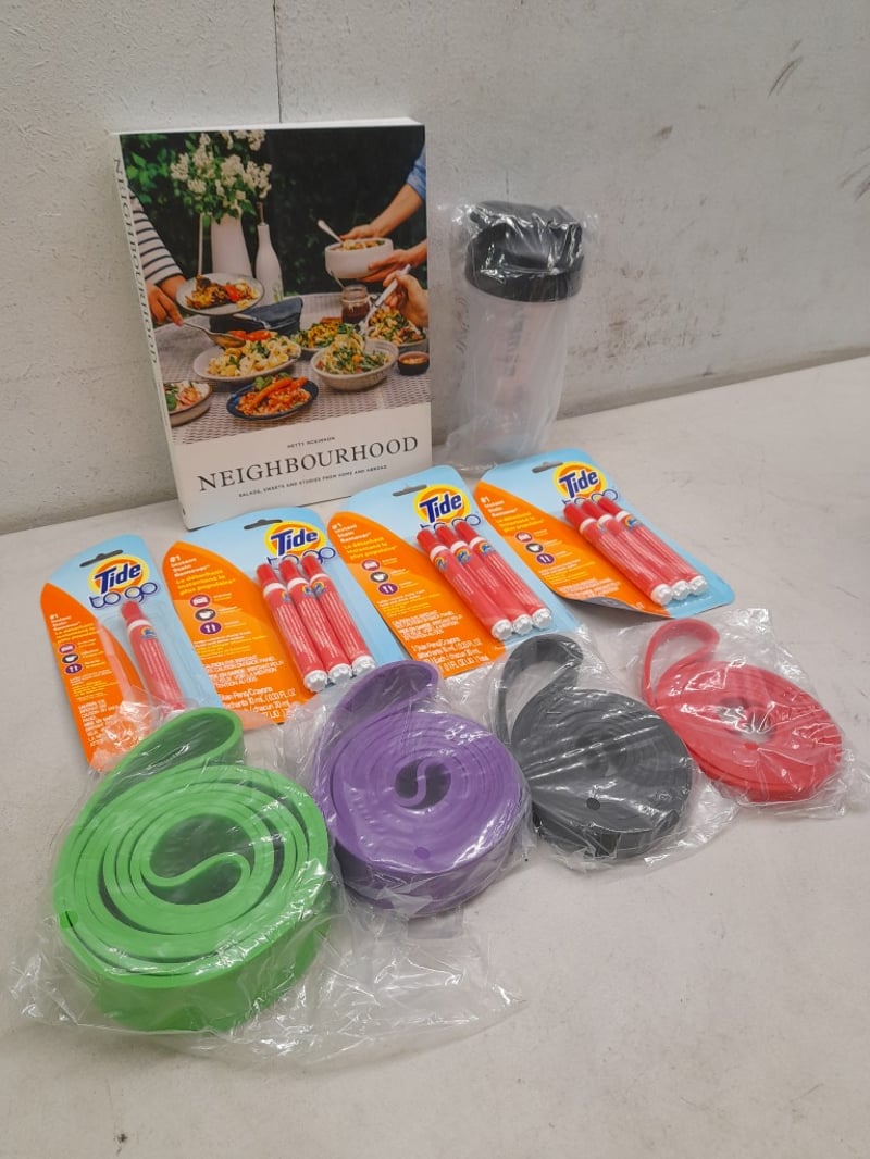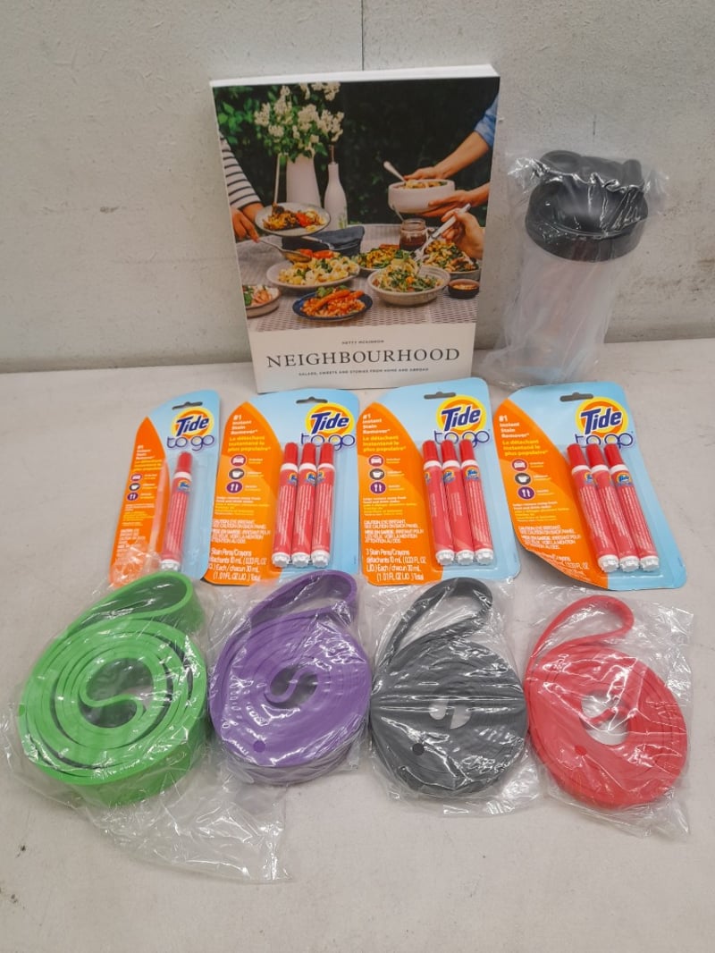Cookbook, Workout Resistance Bands, Shaker Bottle & Stain Removal Pens Sold as lot