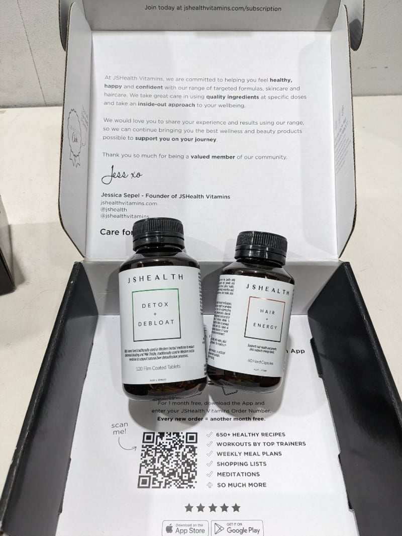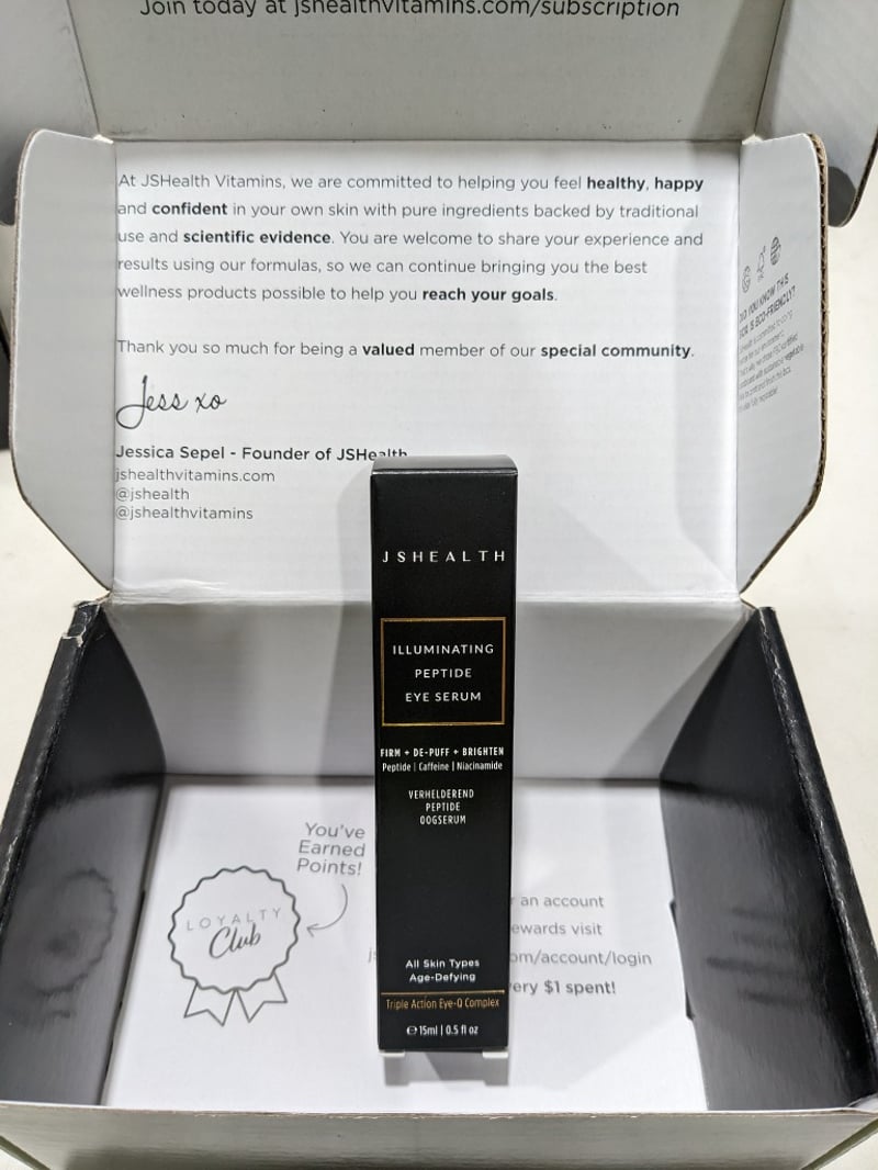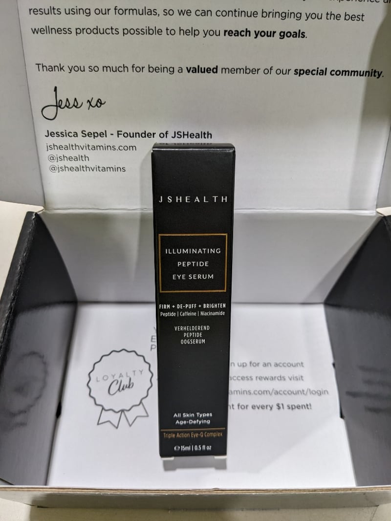 JSHEALTH products includes, illuminating peptide eye serum and detox + debloat and hair energy. Sold as a lot.