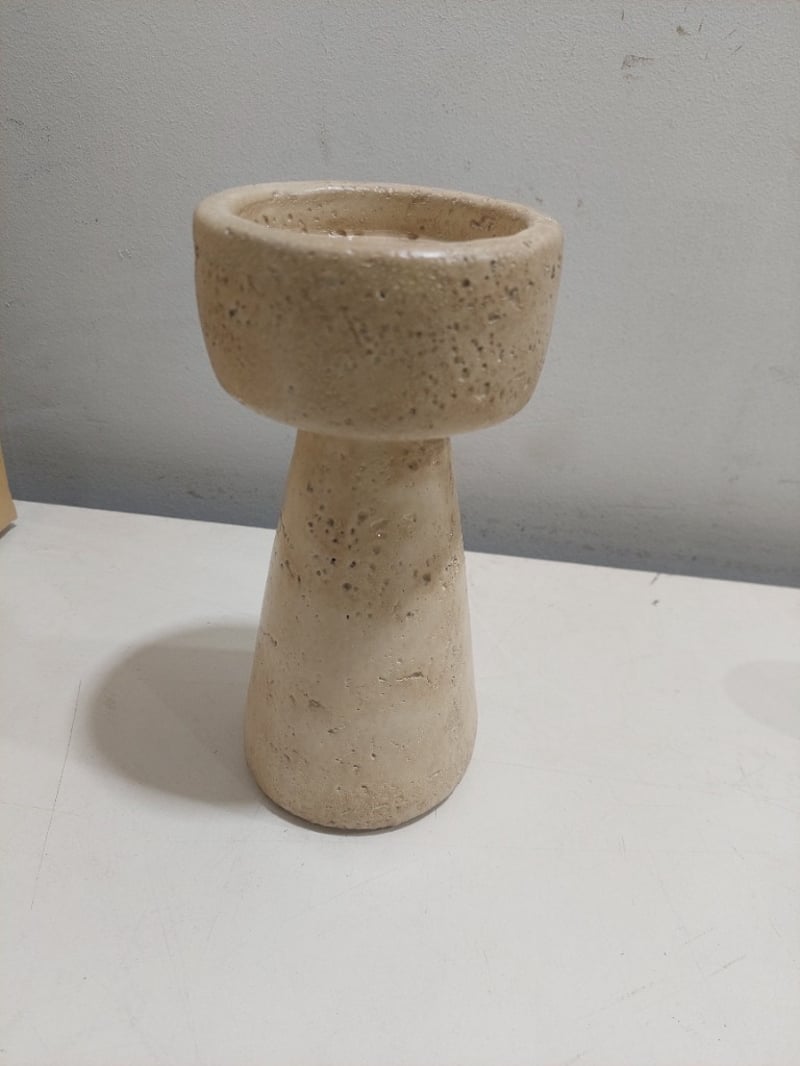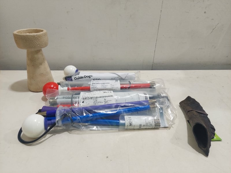 Assorted items, including mobility canes, stone candle holder and goat horn.