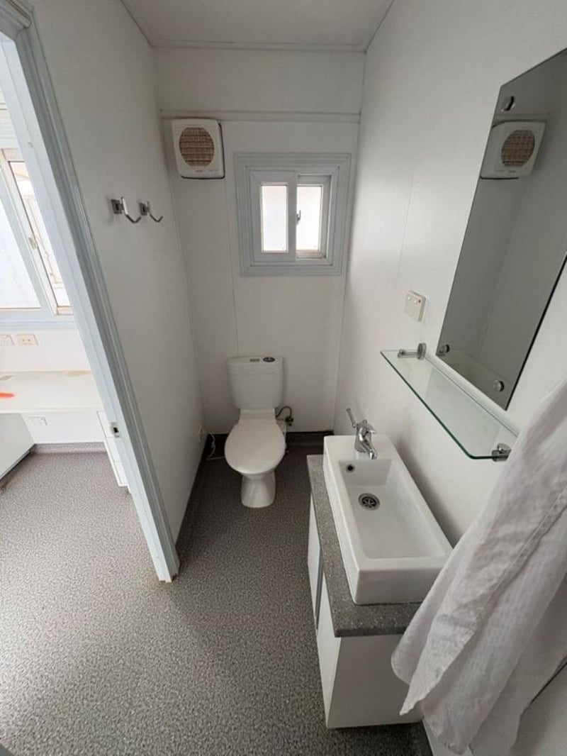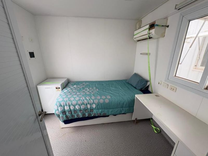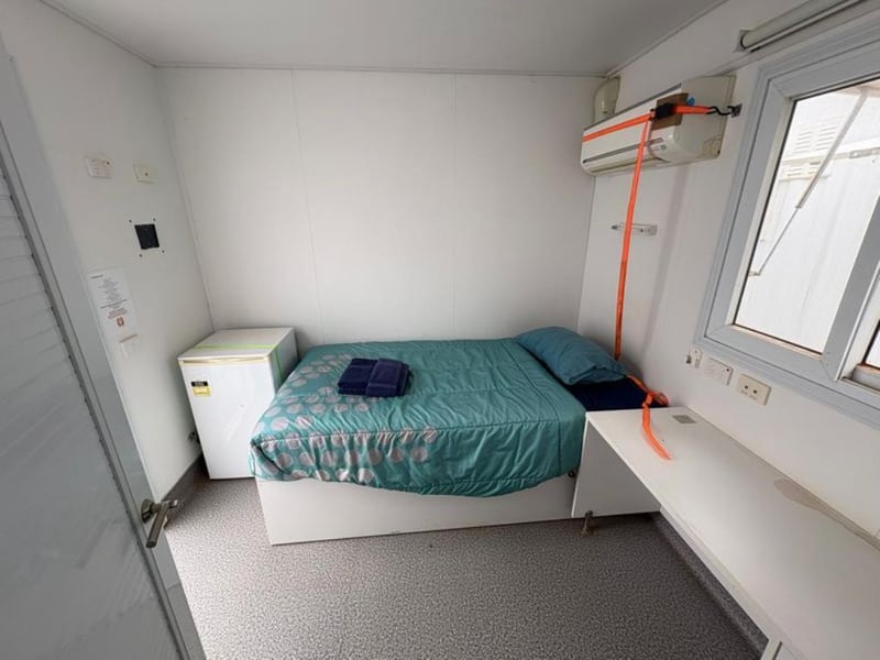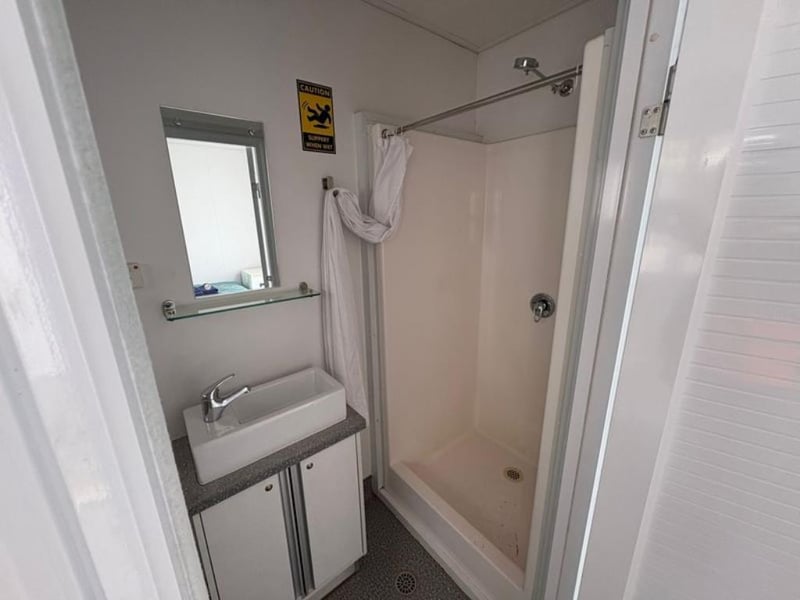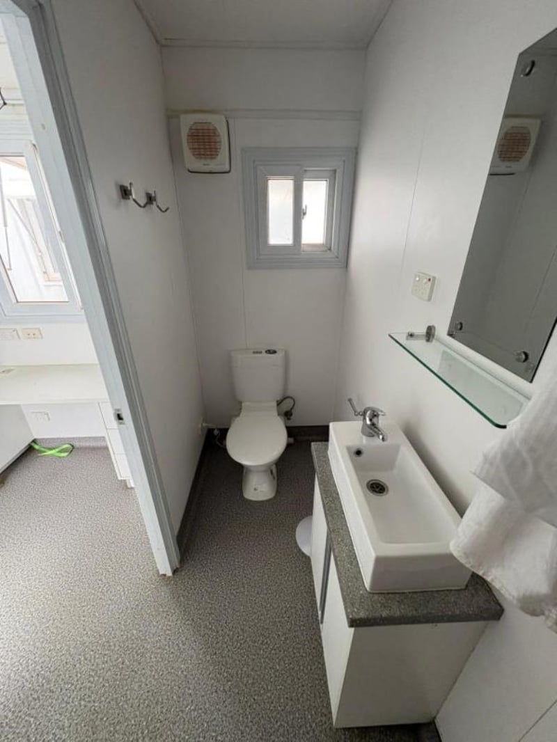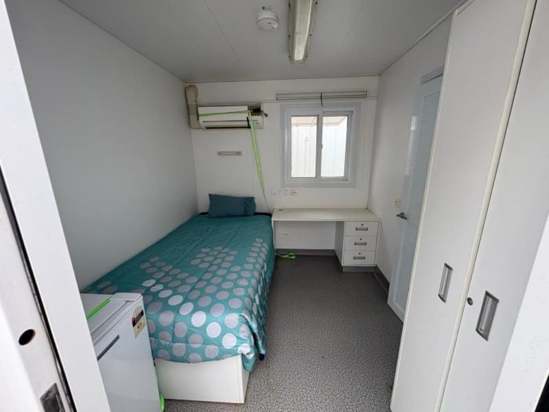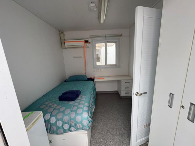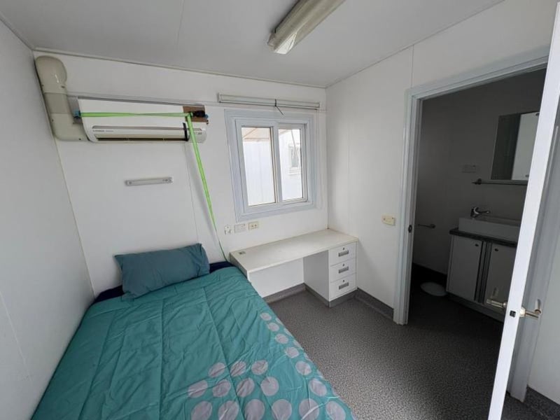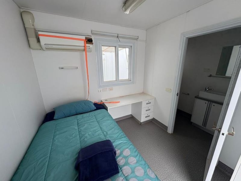 Living are, king single size bed with under storage, Air Conditioning , TV, Storage Wardrobe, Bar Fridge, Writing Desk, with Bedroom linen and blankets, and Separate Ensuite Bathroom moulded Shower Recess, Toilet, Vanity and Mirror. Fully Self Contained Services 3 x AC Units, HWS, Plumbing- Floor Waste System, Covered Industrial Vinyl Floor and Custom Orb Roof Fitted over Building to resist heat and noise- Block Out Window Shutters.