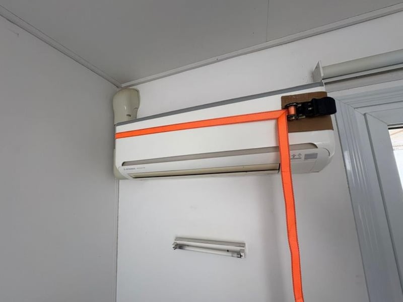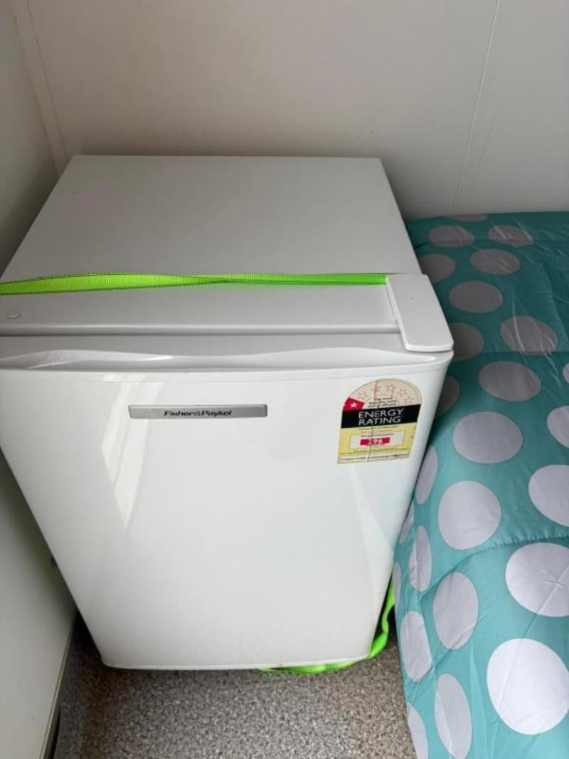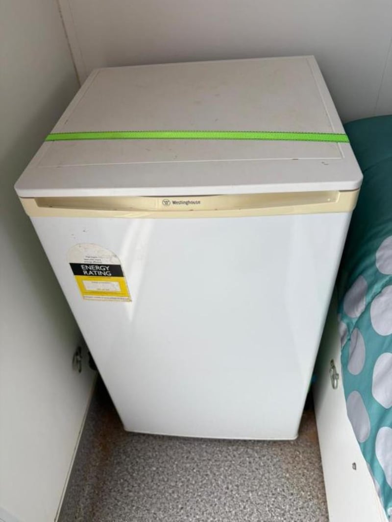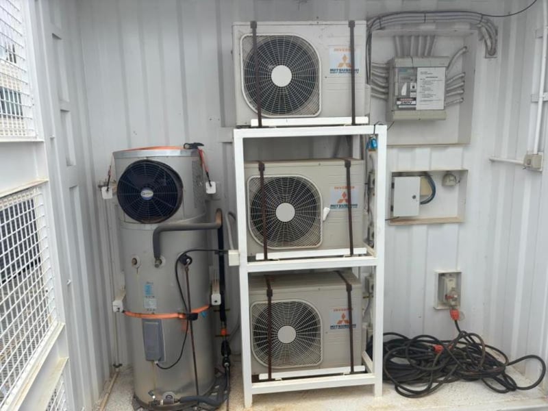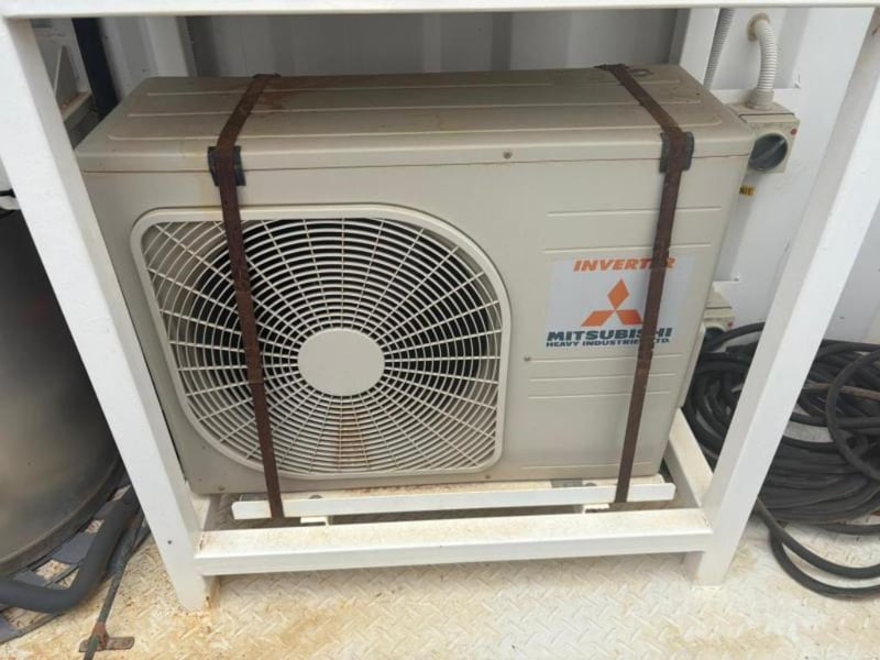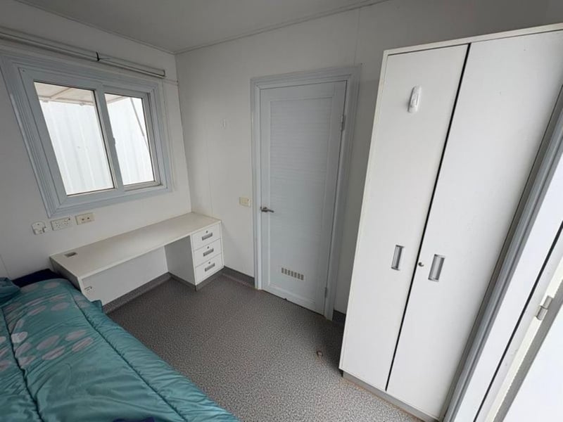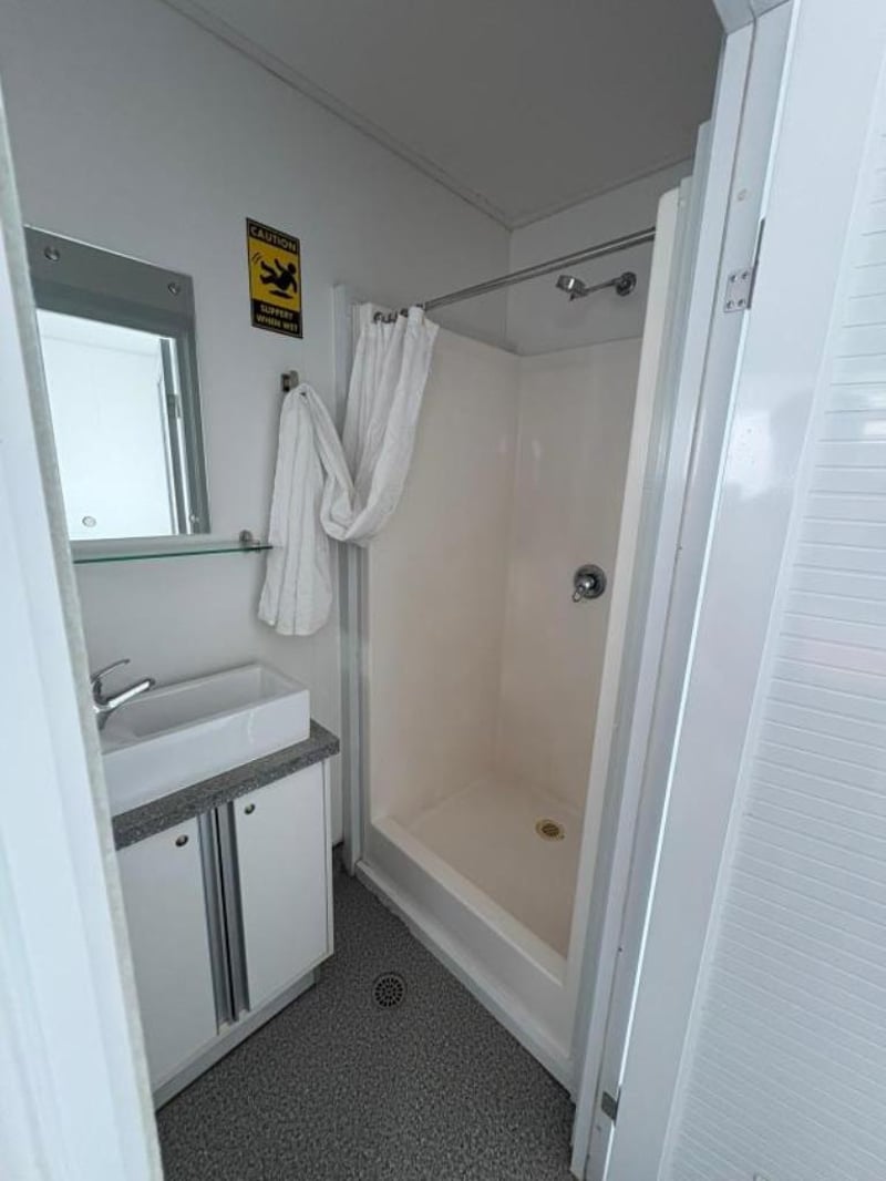 Living are, king single size bed with under storage, Air Conditioning , TV, Storage Wardrobe, Bar Fridge, Writing Desk, with Bedroom linen and blankets, and Separate Ensuite Bathroom moulded Shower Recess, Toilet, Vanity and Mirror. Fully Self Contained Services 3 x AC Units, HWS, Plumbing- Floor Waste System, Covered Industrial Vinyl Floor and Custom Orb Roof Fitted over Building to resist heat and noise- Block Out Window Shutters.