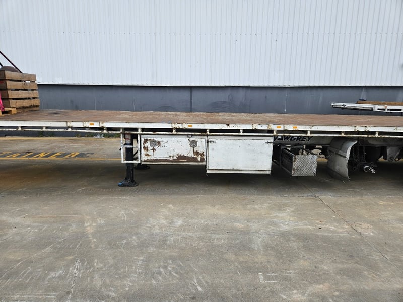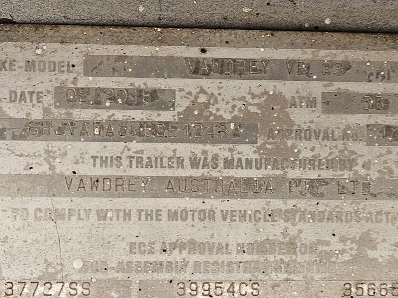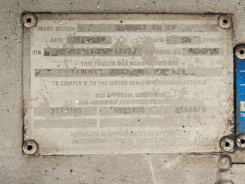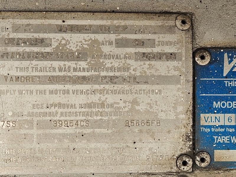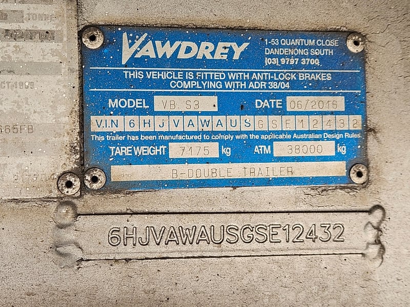 2016 Vawdrey VBS3 Semi B Trailer Year: 2016Make: VawdreyModel: VB S3VIN: 6HJVAWAUSGSE12432Body: Flat Bed TrailerConfiguration: Tri-AxleSuspension: AirbagDimensions: Description: 6 unfitted tyres included. Missing 4 Fitted Tyres. ATM: 38,000 kgTare: 7175 kg