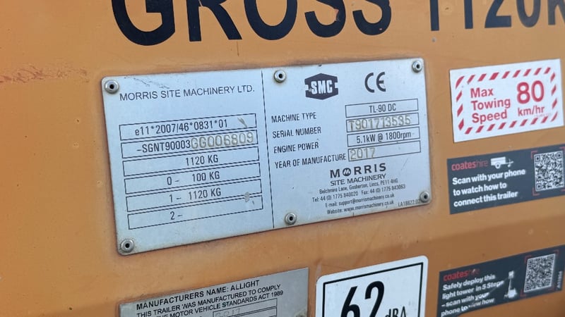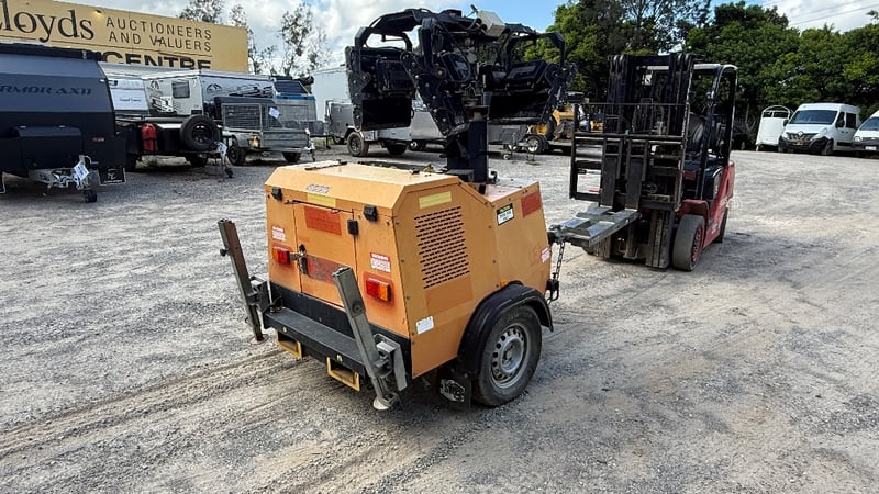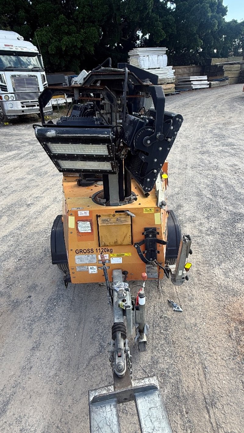 2017 SMC TL-90 DC Mobile Light Tower • Make: Morris Site Machinery • Model: SMC TL-90 DC • Year: 2017 • Serial No.: T907173585 • VIN: SGNT90003GG006809 • Engine Power: 5.1 kW @ 1800 RPM • Aggregate Trailer Mass: 1050 kg • Gross Weight: 1120 kg • Max Tow Speed: 80 km/h • Noise Rating: 62 dBA @ 7m • Trailer Model: Plant Trailer (Allight) Jockey wheel and brakes not in optimal working order Note: Lights said to be not working Ref: 1175158 Contact: Mark David on 0437 318 344 or [email protected]