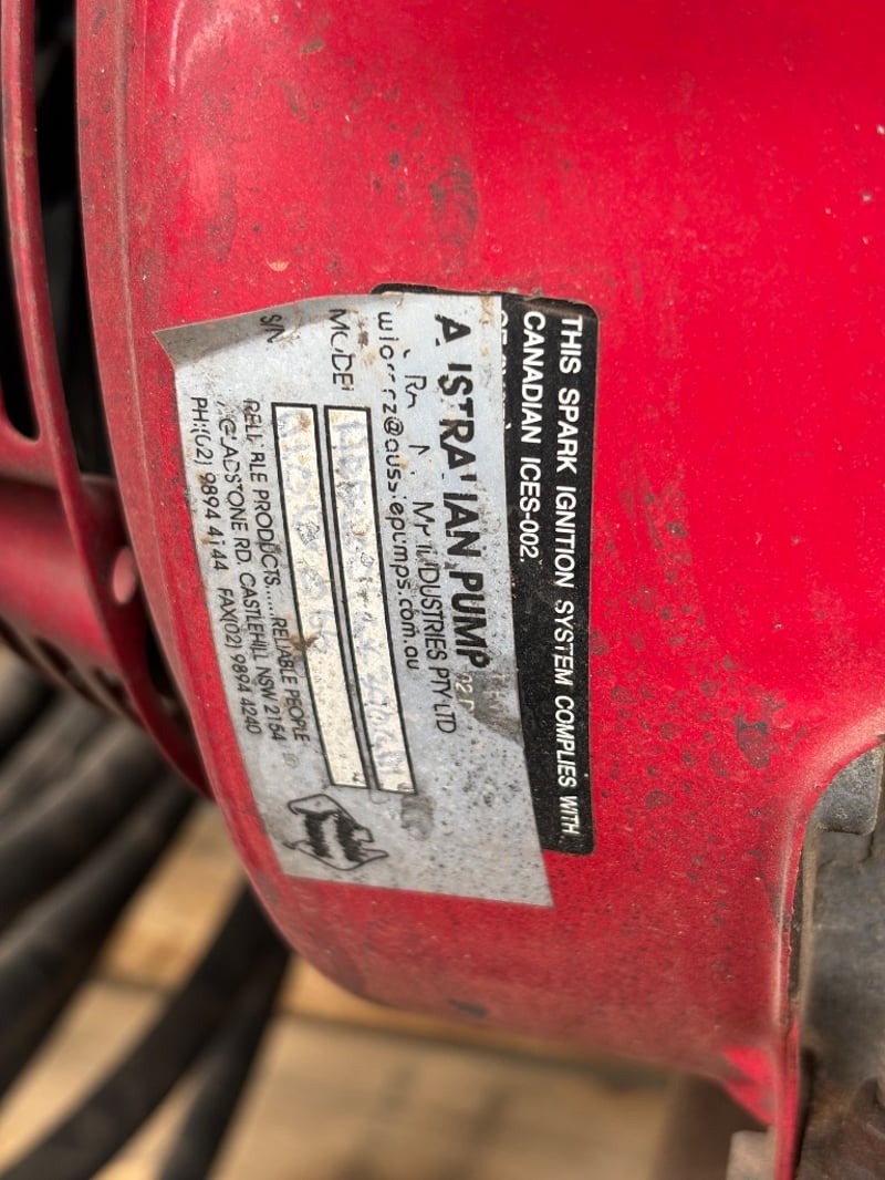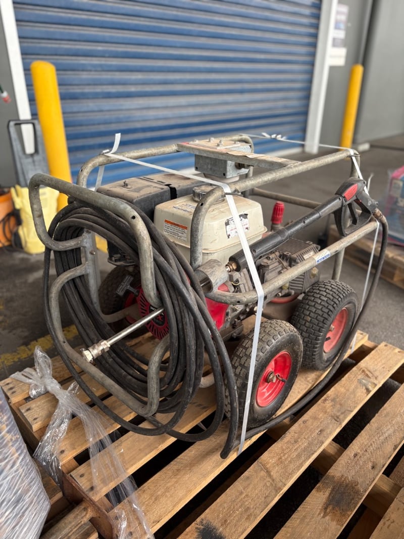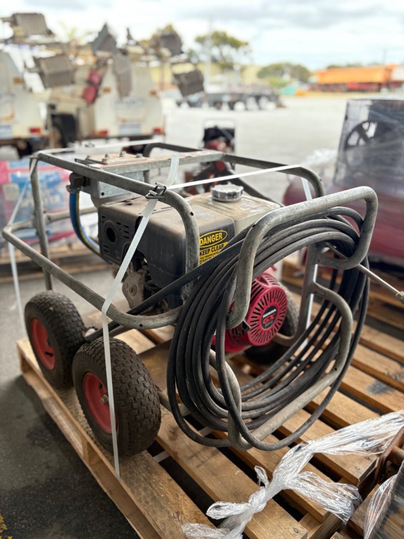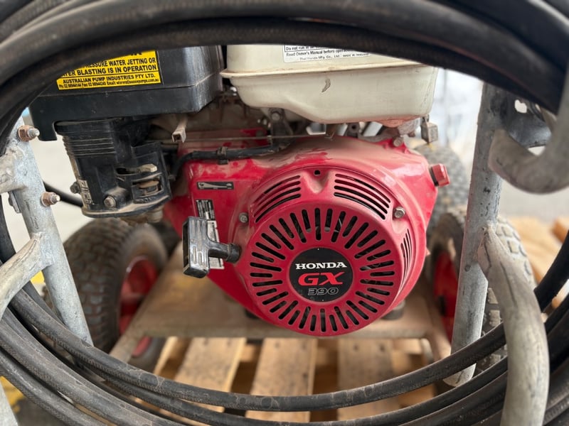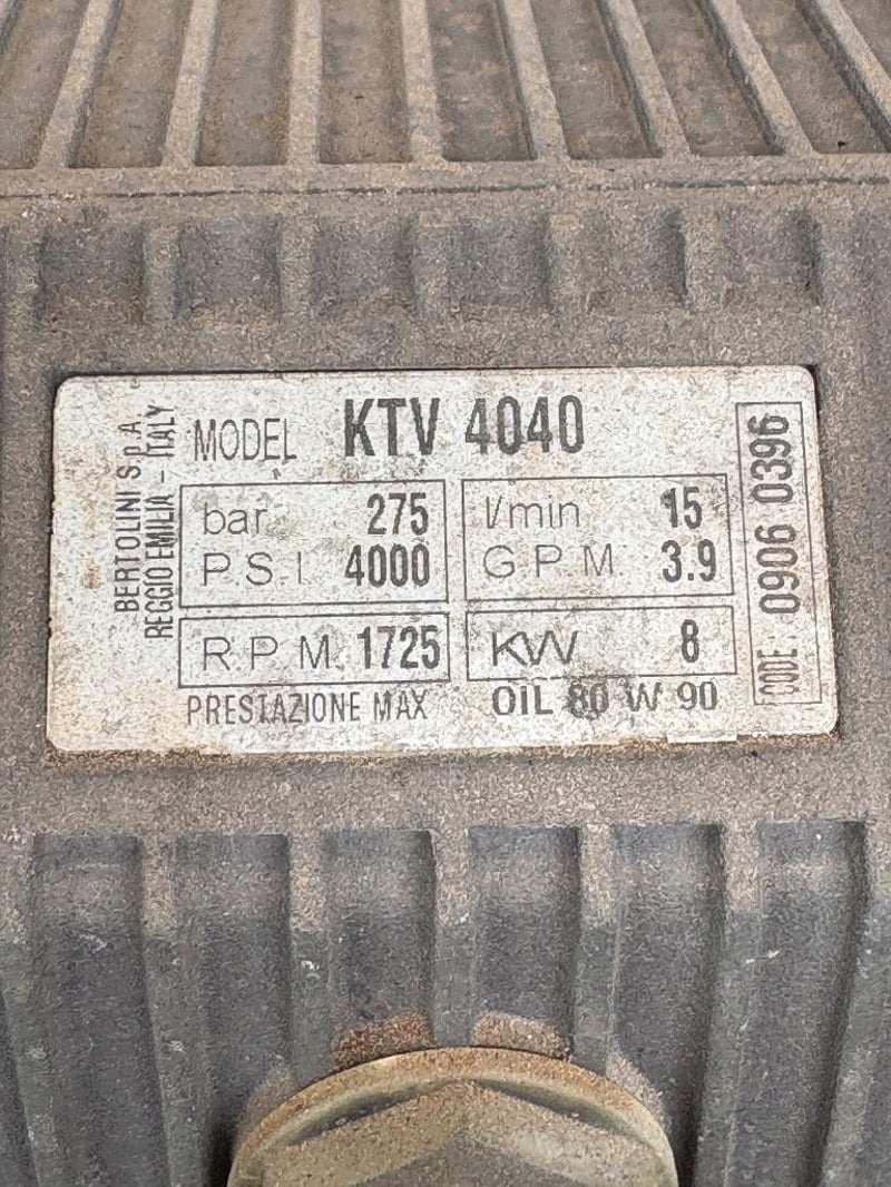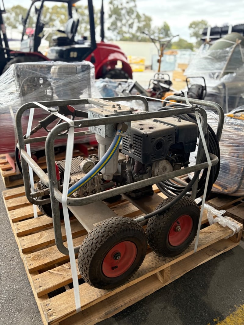Aussie Pumps Heavy-Duty Pressure WasherModel: KTV4040 Pump (Bertolini, Italy),4000 PSI / 275 Bar, 15 L/min Flow, 8 kW Output, Powered by Honda GX390 Petrol Engine. Mounted on Four-Wheel Trolley Frame with Hose and Gun Assembly. Used condition with wear and surface corrosion consistent with age and use.