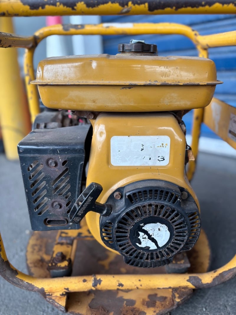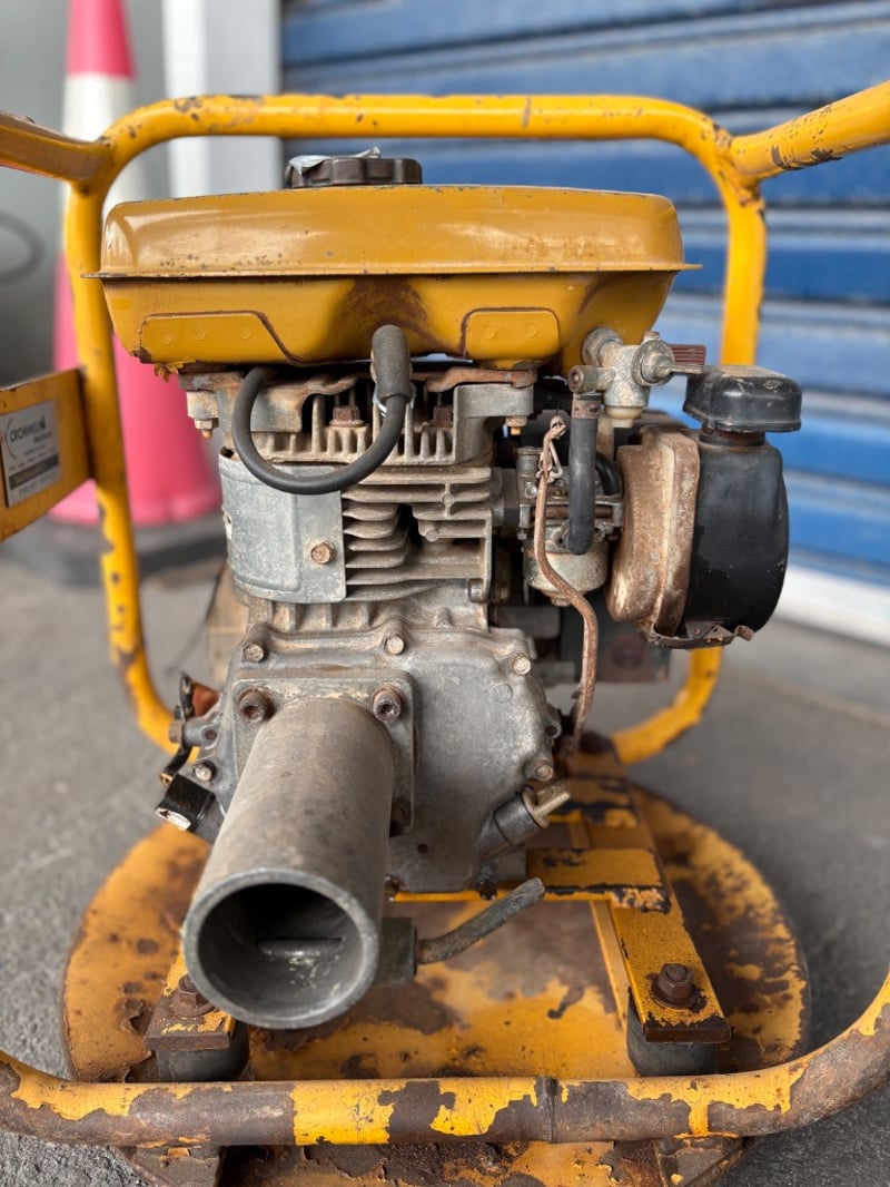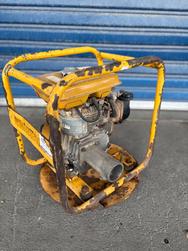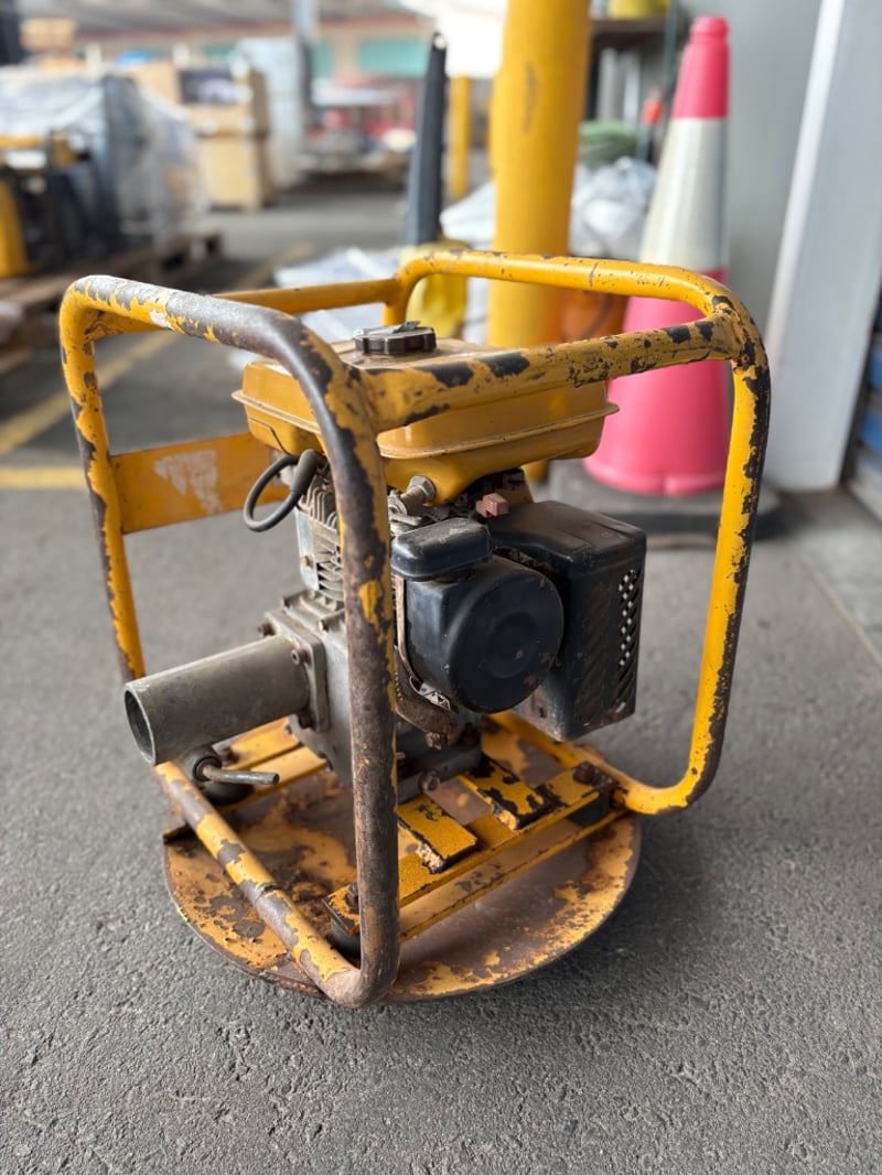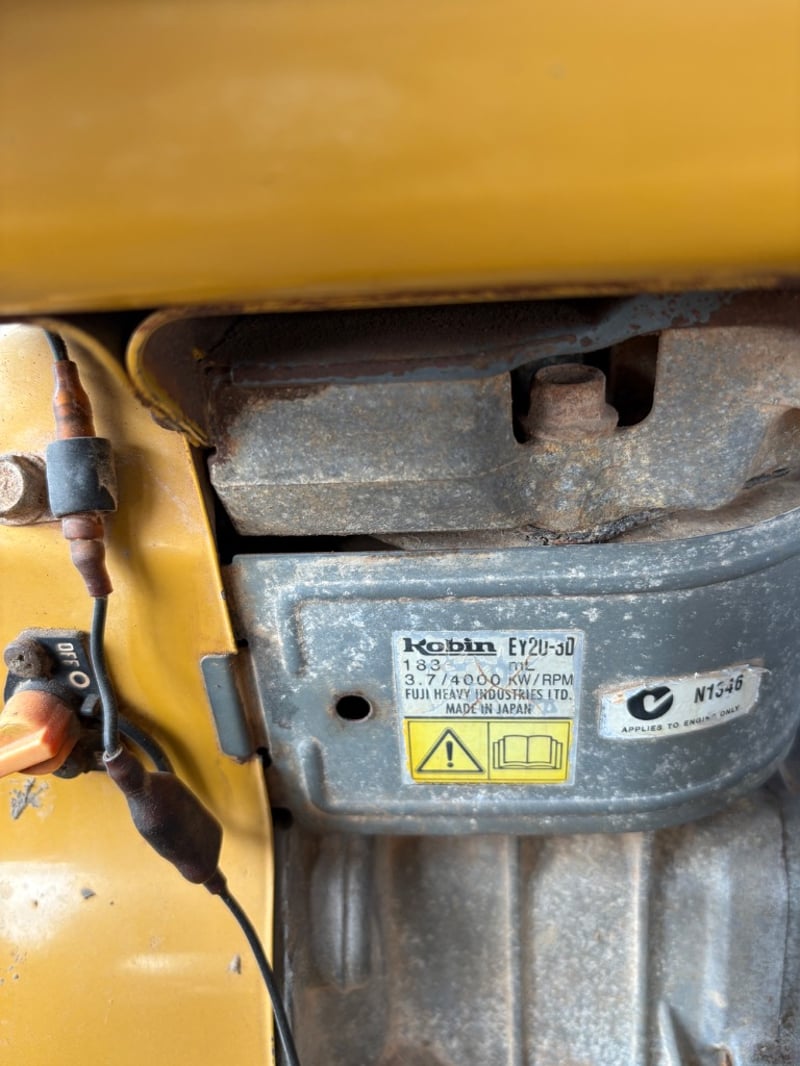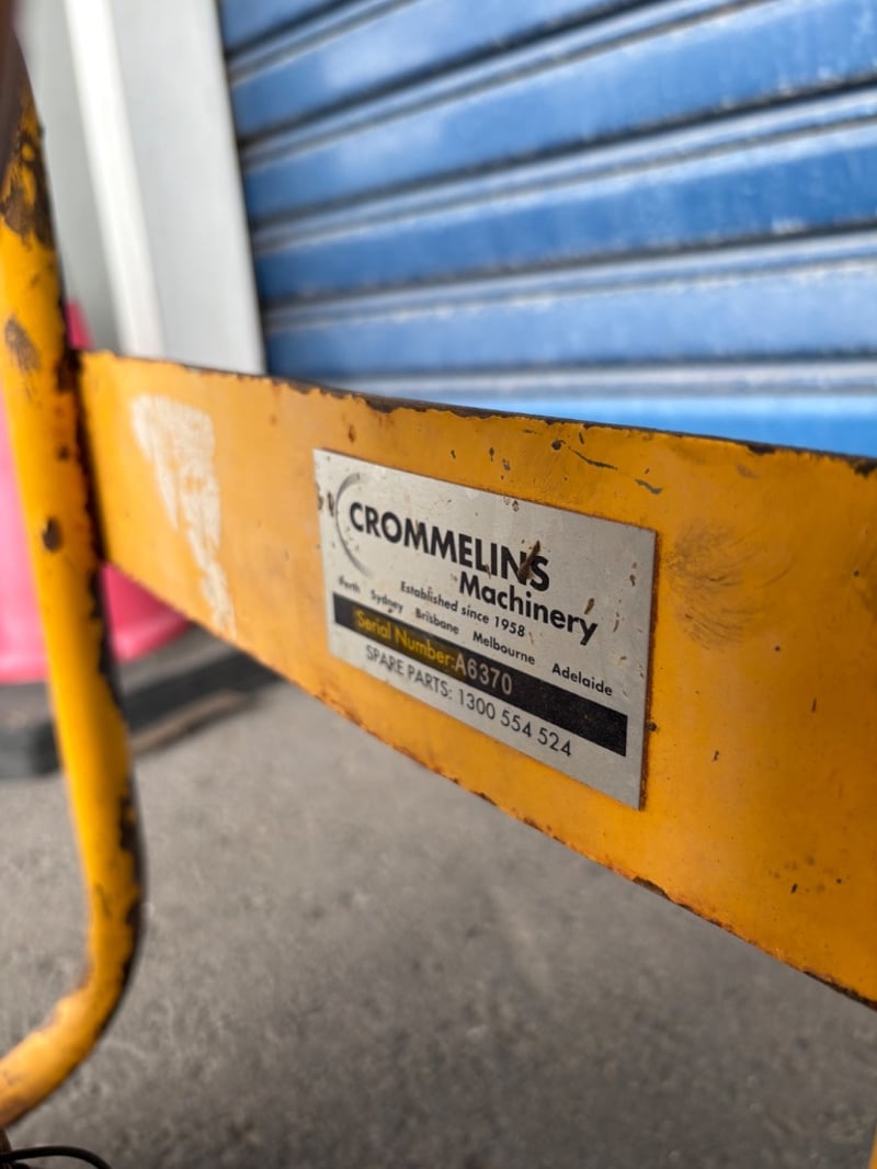 Crommelins Concrete Power Trowel / Finishing MachineSerial Number: A6370, Engine: Robin EY20-3D Petrol Engine (3.7kW @ 4000RPM), Made in Japan. Mounted in protective yellow cage frame. Used condition with surface rust, scratches, and wear consistent with site use.