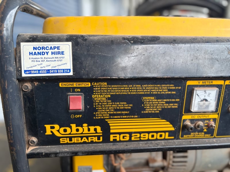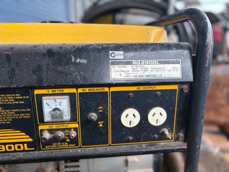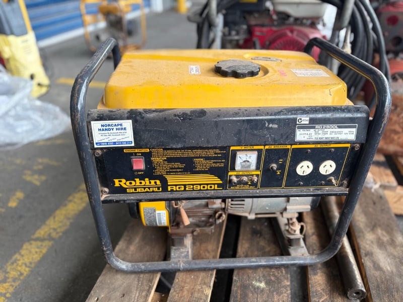 Robin Subaru RG2900L Petrol Generator, Model: RG2900L, AC Voltage: 240V / 50Hz, Rated Output: 2100W, Max Output: 2400W, DC Output: 12V–8.3A, Manufactured by Fuji Heavy Industries Ltd., Japan