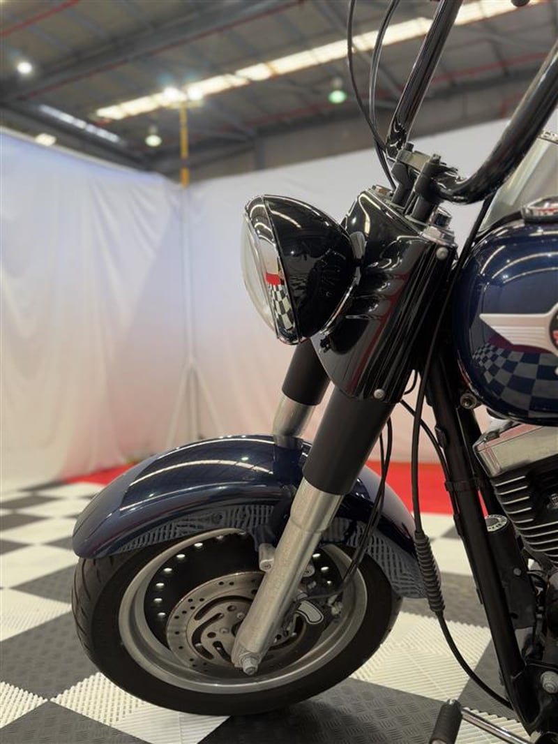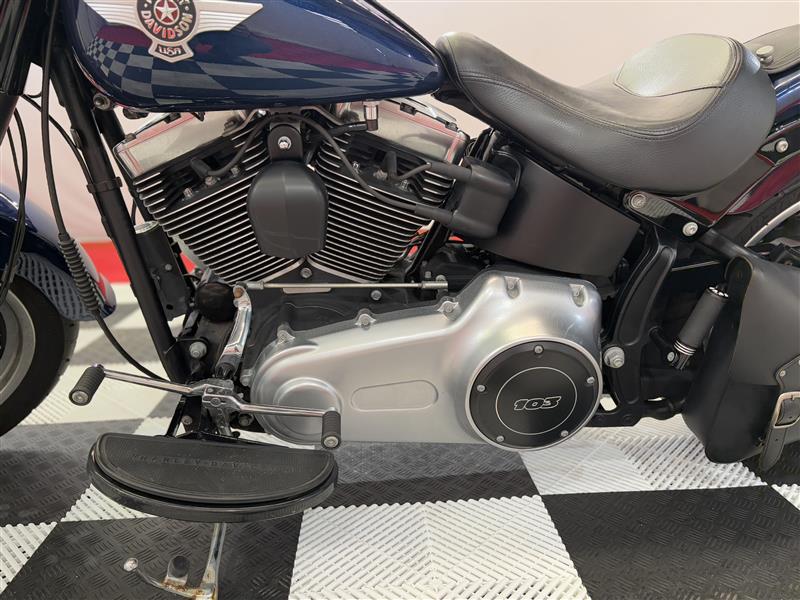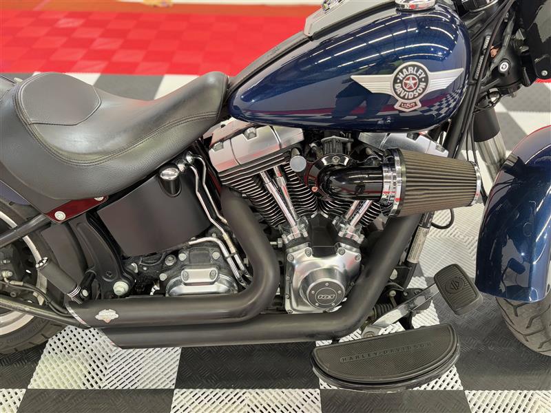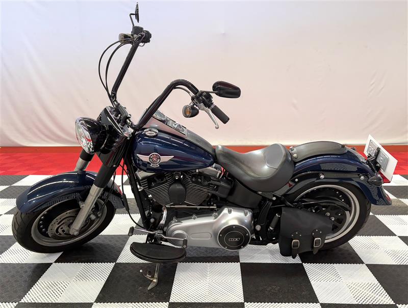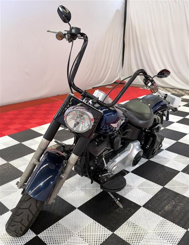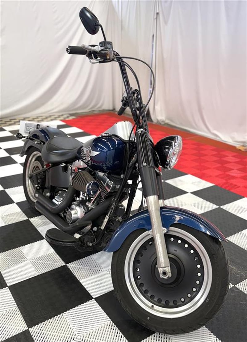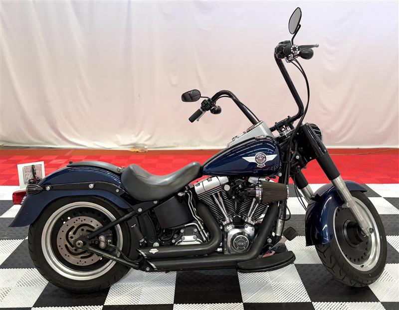 Classic Harley Davidson Fat Boy Lo Featuring High-Rise Ape Hanger Handlebars, Vance & Hines-Style Matte Black Exhaust System, Chrome Screaming Eagle Performance Air Intake, Forward Controls, Side Saddle Leather Pouch, And Footboards.