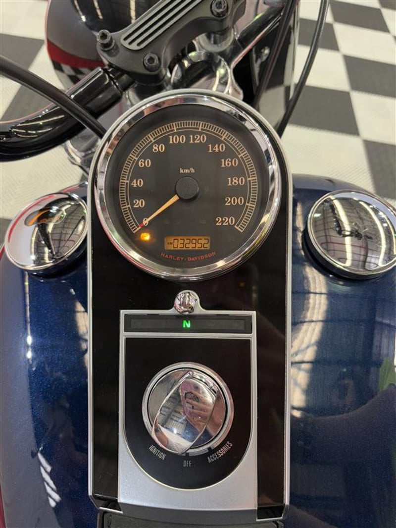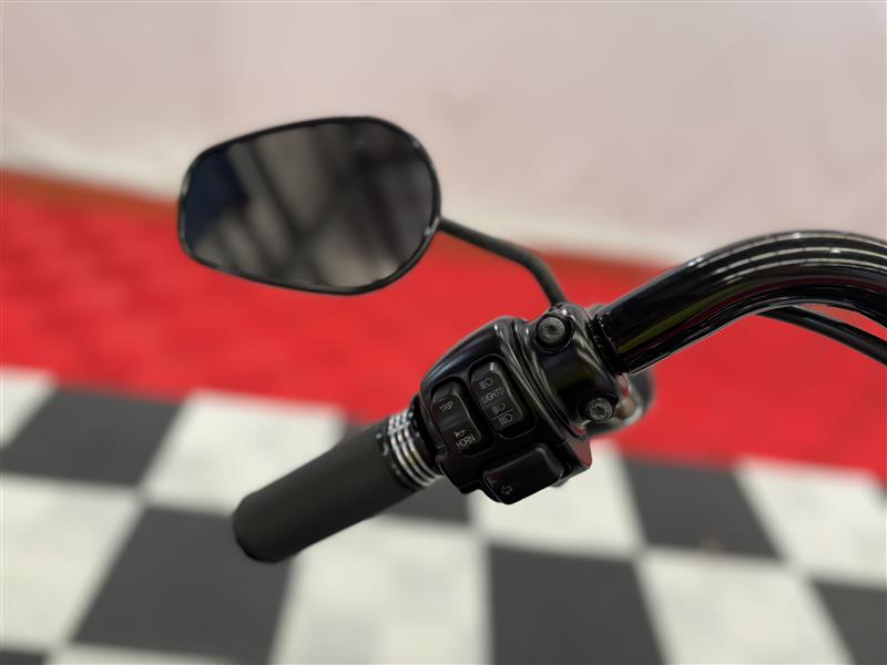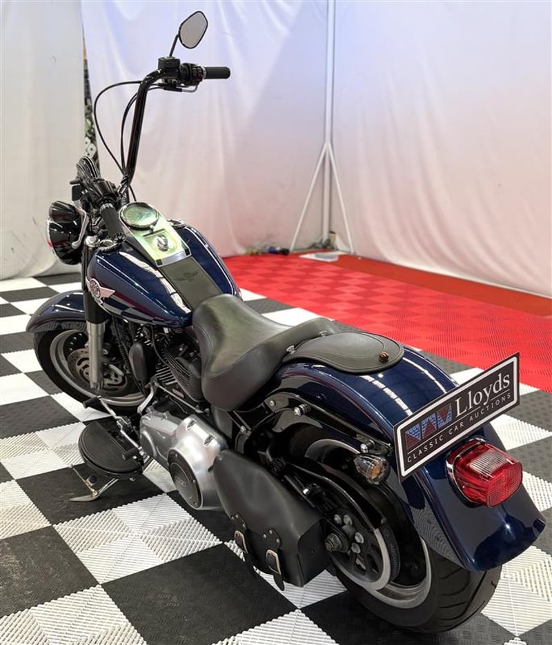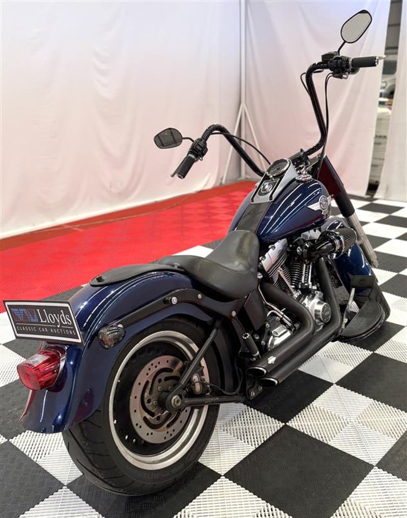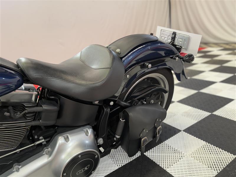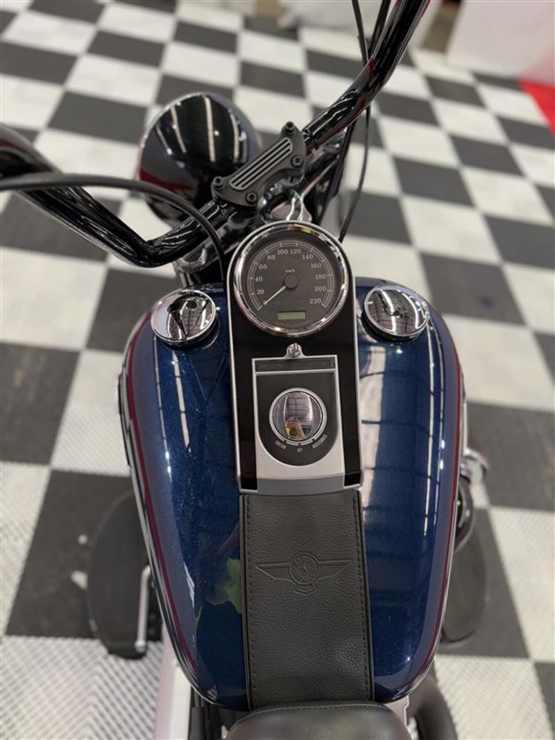 Classic Harley Davidson Fat Boy Lo Featuring High-Rise Ape Hanger Handlebars, Vance & Hines-Style Matte Black Exhaust System, Chrome Screaming Eagle Performance Air Intake, Forward Controls, Side Saddle Leather Pouch, And Footboards.