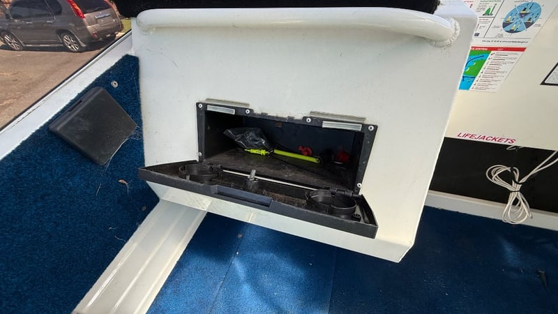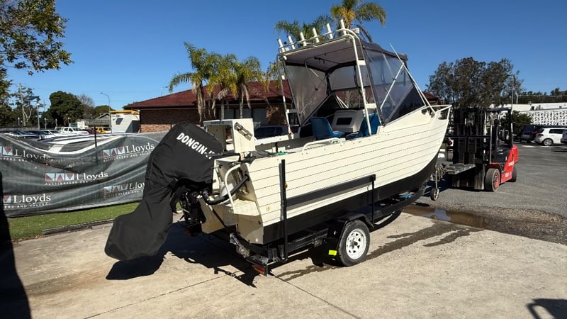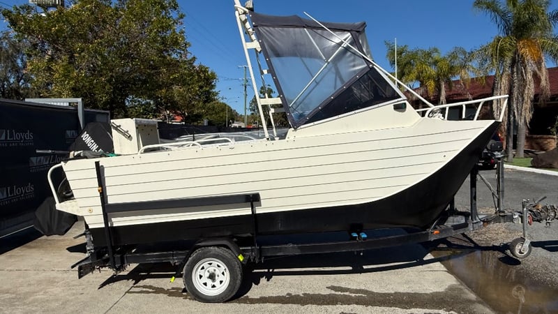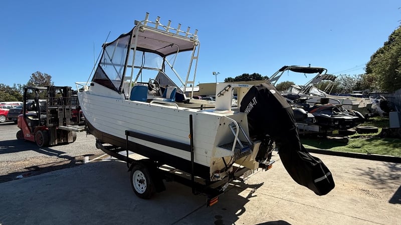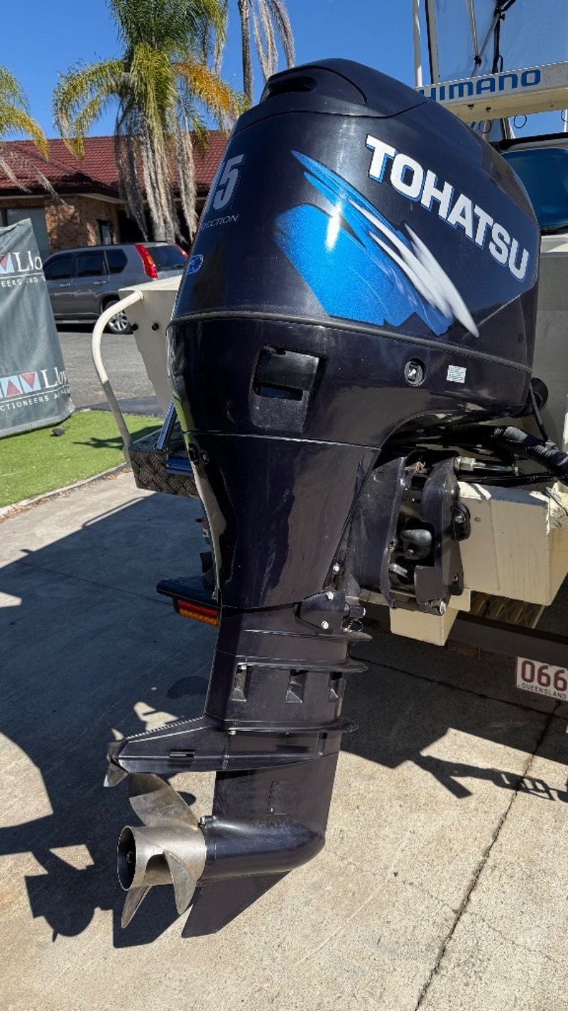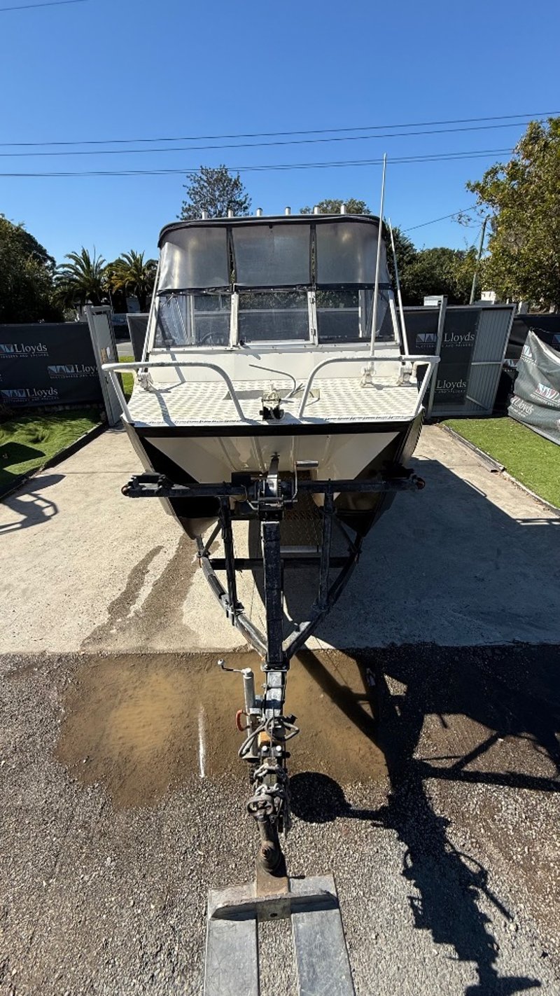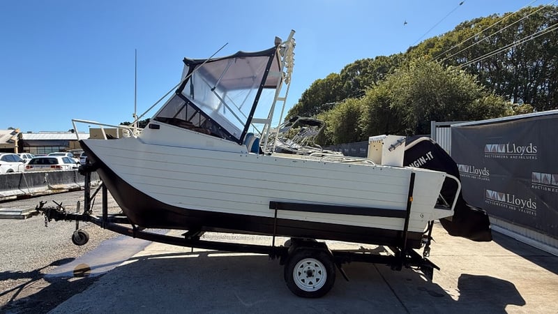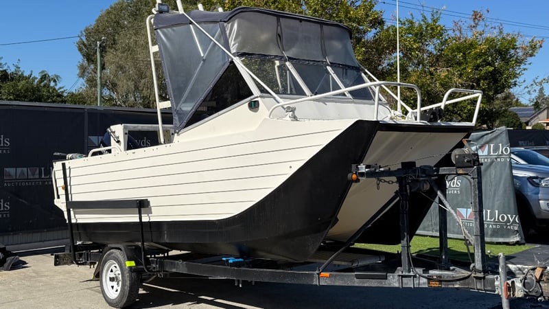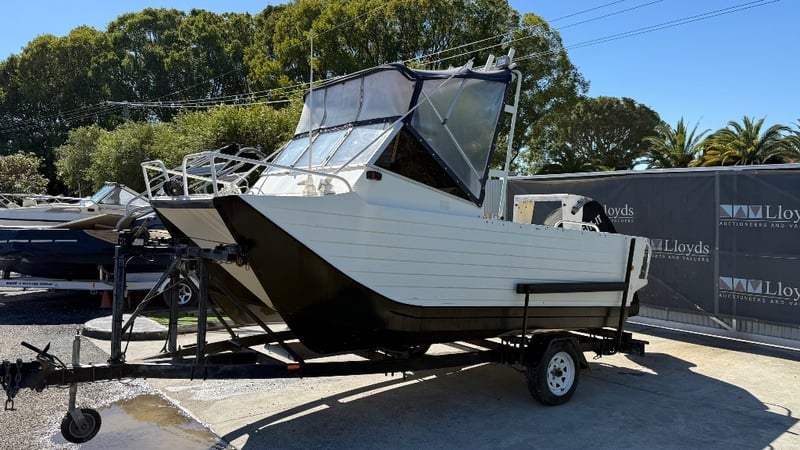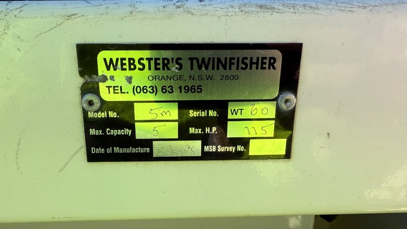 1988 Webster Twin fisher Boat Year: 1988 Make: Webster Model: Twin Fisher Body: Catamaran Twin Hull Hull Material: Fibre Glass Capacity: 5 Colour: Black and White Engine: 115 Tohatsu Direct injection 2 Stroke Engine Model: MD115A2 Engine no: 031193AF Engine Hours Indicating: 10 hours Description: Electric Motor, Cover, Fish Finder, Bait Board, Bait Well, OutRiggers, Tool Box, Reef Anchor, Electric Winch, Storage Total length on trailer: 5+ m HIN: AUWTFRH060G898 Vessel length: 5 ON A TRAILER: Year: 1988 Make: Easy Tow Body: Twin Hull Boat Colour: Black Configuration: Single Axel Suspension: Leaf Description: Winch, Park Brake, 50mm Tow Hitch, Flat Pin Connector Chassis No.: 6TDT22Y2034000532 ATM: 1360kgs Tare: 320kgs Total length: Key # MMR69 carrara Lloyds stock #997058+1 #MMR
