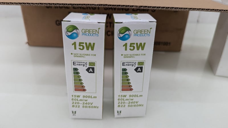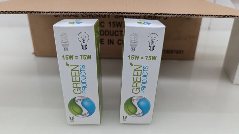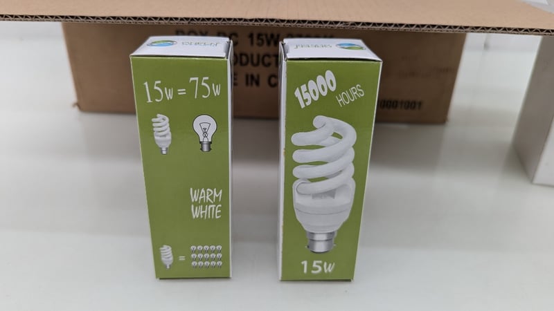 Spiral Type Energy Saving Lamps, Green Products, 15W, 900Lm, Warm White, B22 Base, 6 Globes Per Box, Quantity 12Sold As Lot