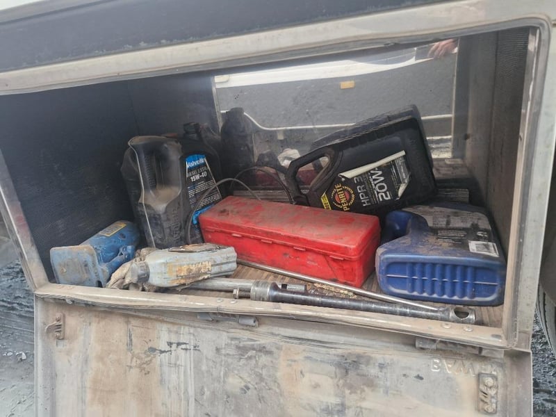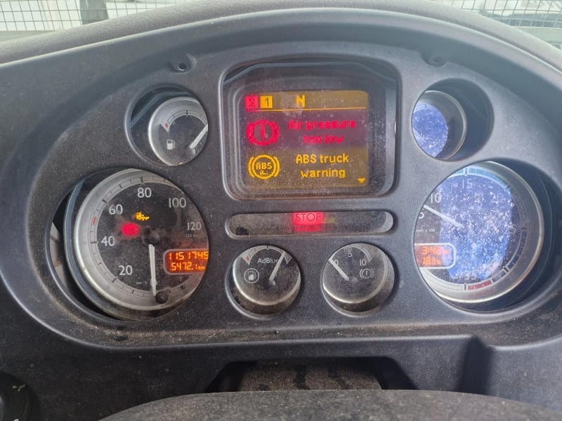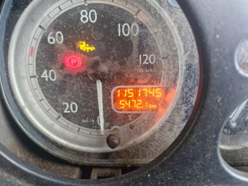 NOTES: ABS warning light on dash, Windscreen wipers inop, Damage to front bar, unsafe and sharp edges, Steer mudguards damaged, DS window weather shield strip broken and sharp, DS seat shock absorbers inop, DS seat base unsecure, DS seat belt does not retract, DS seat mount has rust around bolt, Brake pedal antislip pad worn through, Demister inop, no change in air flow Horn inop, RH high beam inop, RHF top marker on cab inop, LHF side indicator inop, LH side marker 3rd and 5th inop, LH headlight inop LHD air leak when service brake applied, Front grill does not lock, Windscreen has chips,Coolant expansion tank unsecured, Air tank held on by rachet strap, No battery cover, Steer tyres have wear marks, No fan shroud, Drive swaybar bushes unserviceable, LH drive brake rotor heat cracks, Air leaks in control box, Fuel tank rear mount bent, Engine oil leaks (dripping,), Engine mounts broken, RH steer brake pads excessive wear (Steel on steel), RH headlight missing weather seal, No steer mudflaps,