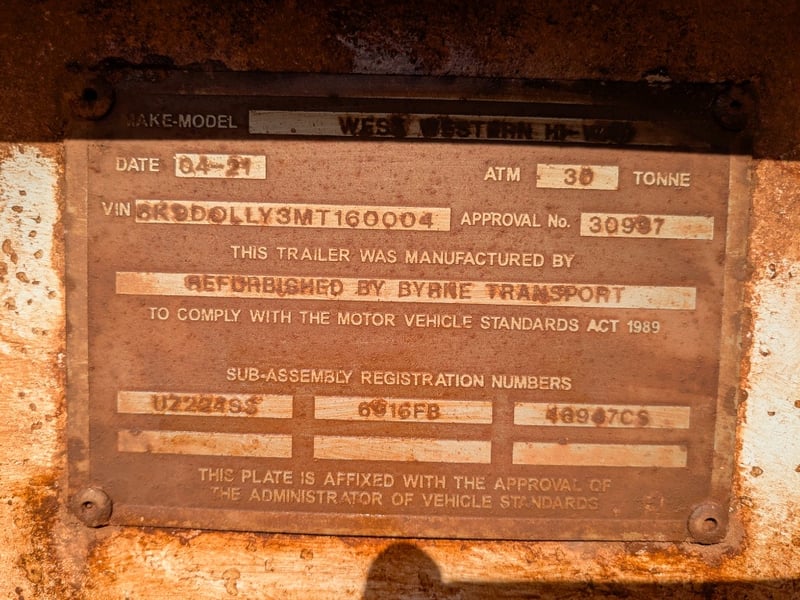 2021 WFS Western Hi-WayYear: 2021Make: WFS WesternModel: Hi-WayConfiguration: Tri-AxleBody: DollyColour: RedSuspension: SpringFifth Wheel: Yes, FittedTyre Size: 11R22.5Rim Profile: 10-Stud SteelSerial No.: Not SpecifiedDescription/Extras; Heavy-duty WFS Western Hi-Way tri-axle dolly, refurbished by Byrne Transport. Built for robust roadtrain applications, this dolly features spring suspension, steel deck construction with checker plate, and a fitted fifth wheel. Equipped with multiple airlines and electrical connectors for trailer integration. Unit shows signs of red dirt exposure typical of regional haulage operations. Tyres fitted are Vortex 11R22.5 on 10-stud steel rims. Compliance plate visible, with an ATM rating of 30 tonnes.Engine No.: Unsighted VIN: 6K9DOLLY3MT160004Note : Inspections RecommendedATM: 30,000kgGTM: Not SpecifiedFor more information Contact: 0489 996 389 or Email: [email protected] Motor Dealer Licence # MD27332Lloyds Stock: 562686+1