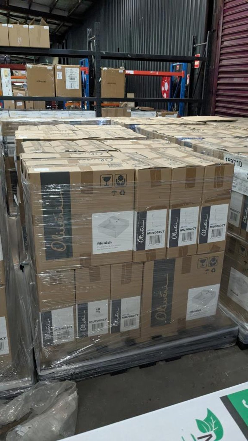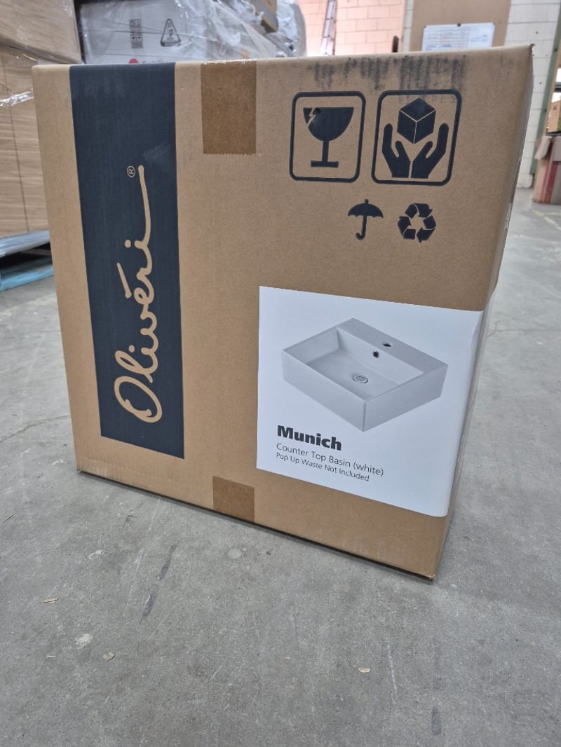 RRP $325 - Oliveri MU7063CT Munich Counter Top BasinTap holes: 1Overflow: YesWaste outlet: Not IncludedColour: WhiteBasin size: 460mm x 460mm x 160mmBowl capacity: 6.8 LMaterial: Vitreous ChinaInstallation: Counter TopWeight: 17.0 kgNOTE: Waste trap not includedBID per pallet, 24 to pallet