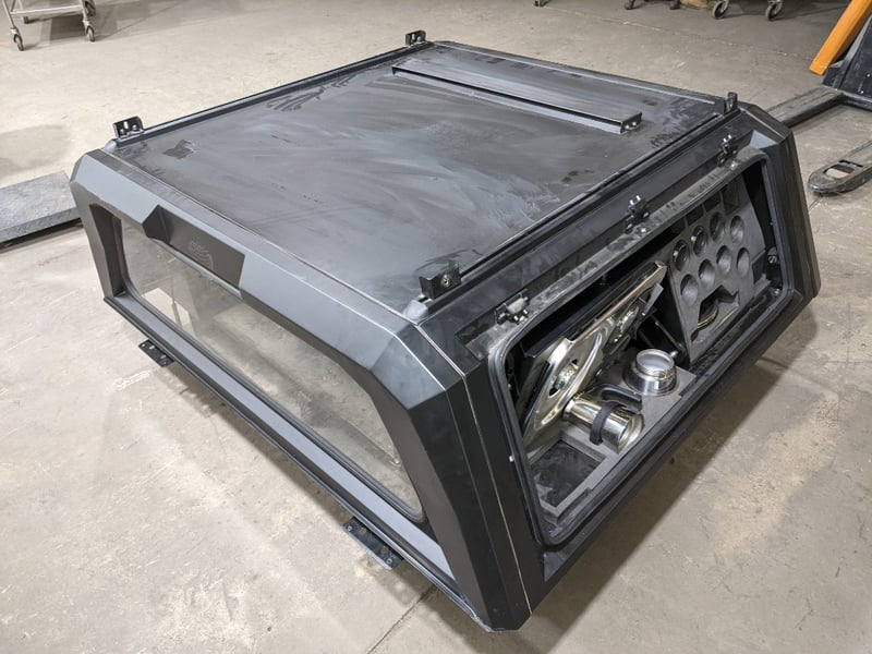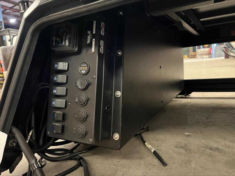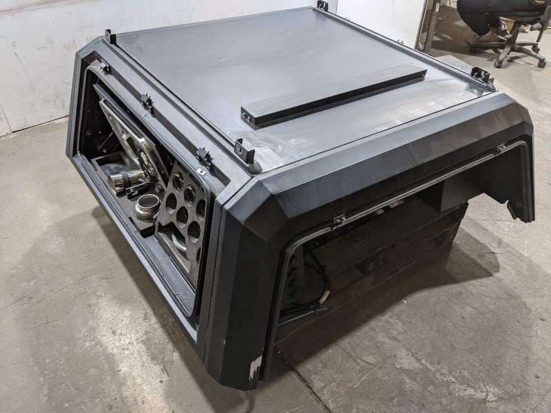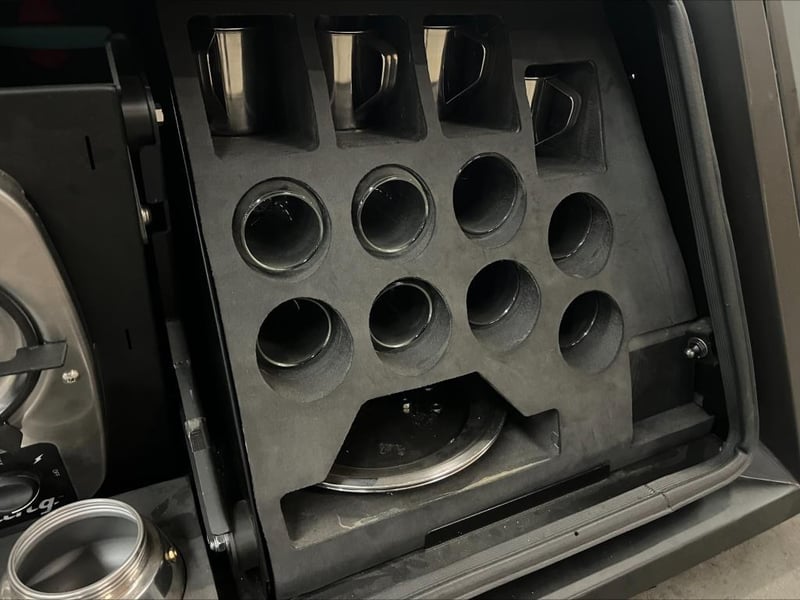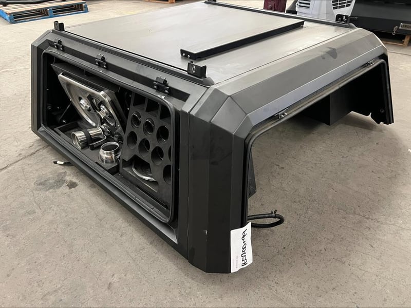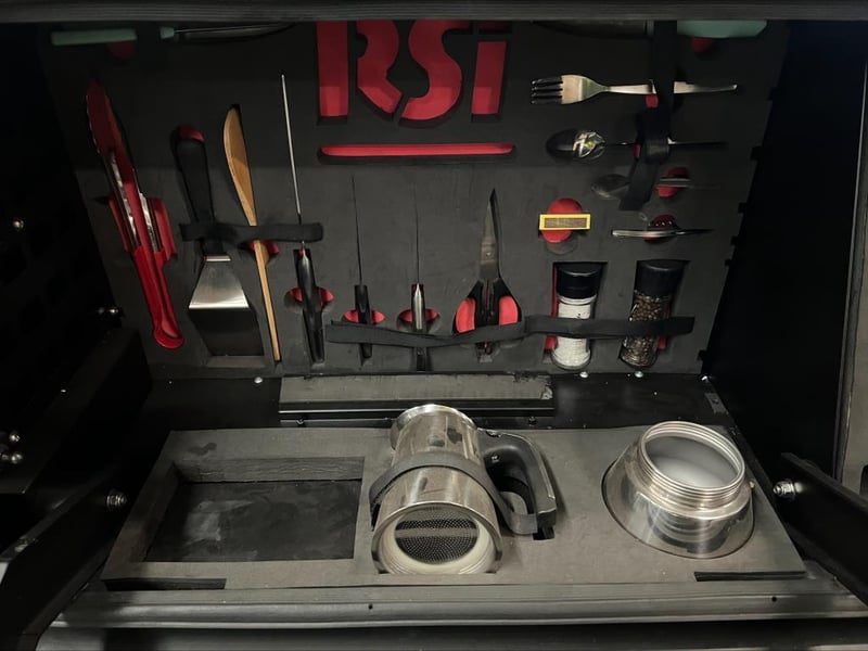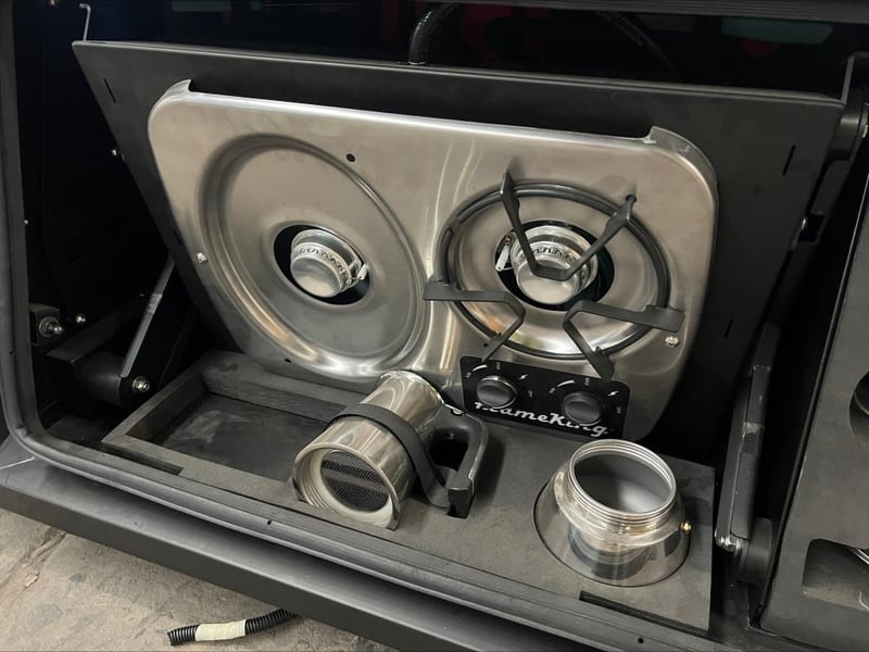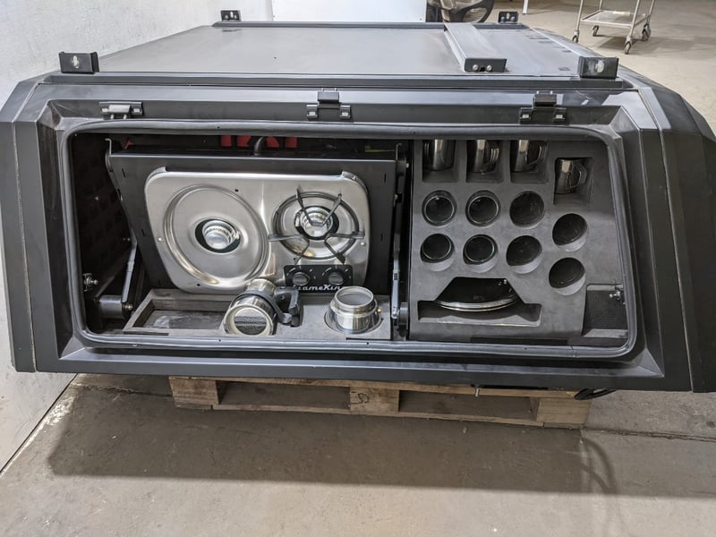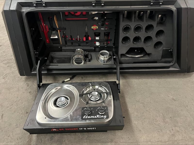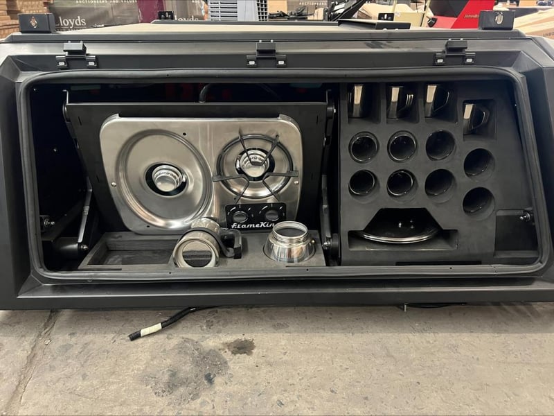 Adventure Canopy Utility Setup, Rear and Side Access Doors, Multi-Slot Storage, Removable Panel Design, Stainless Steel Construction, Black Finish Extras: LED light strip setup, Fold-out FlameKing Cooktop, includes kettle, barbecue utensil set, mugs, glasses, cutlery, and plates Dimensions: H70CM x W159CM x D155CM Note: Signs of wear,