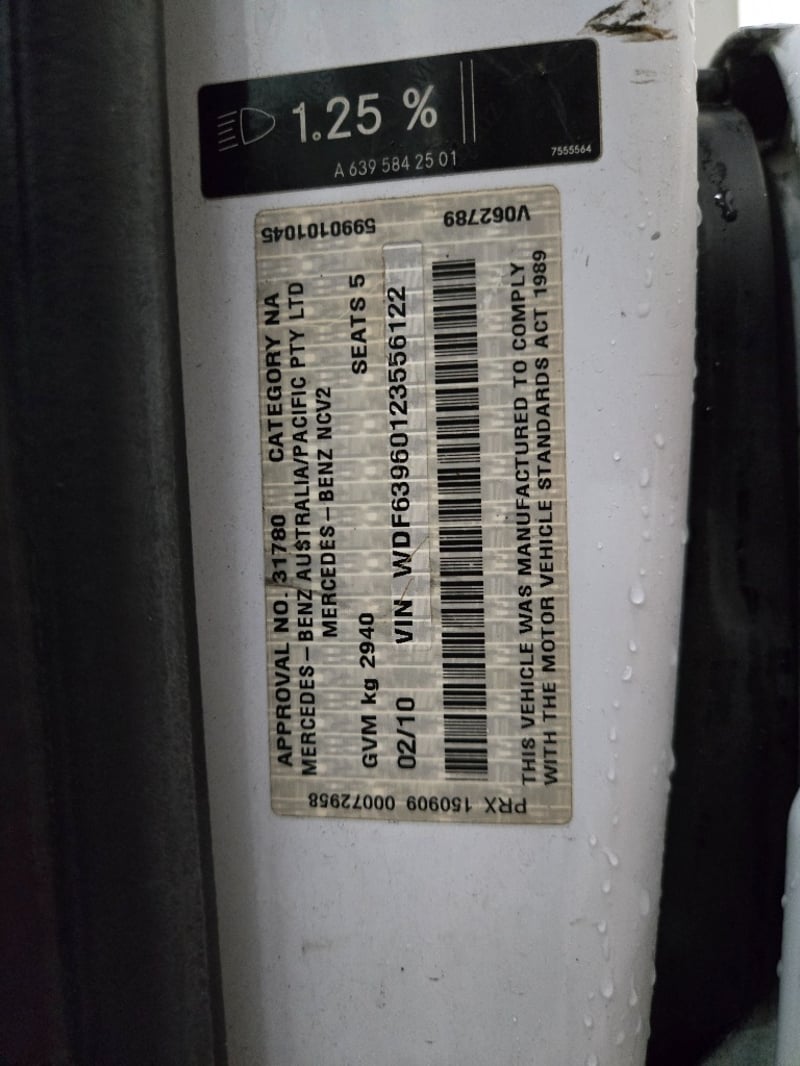 2010 Mercedes-Benz Vito 115 CDIYear: 2010Make: Mercedes-BenzModel: VitoSeries: 639Badge: 115 CDIBody: 5-Door VanDrive Type: Rear wheel driveOdometer: Indicating 358,126 KilometresEngine: 4 cylinders, Diesel Turbo Intercooled, 2.1LTransmission: AutomaticColour: WhiteSeats: 5Description/extras: Short wheelbase, SRS, Reverse camera, Logbooks/Owner's manual. Towbar, Roof Racks.Notes: Engine turns but is no longer starting. Service overdue, Airbag and seatbelt light on, Brake pad light on, Rip in seat Price Guide - $4,200 - $6,450 (Based on Unmodified Vehicle) VIN: WDF63960123556122ENG No: 64698051798404 (as per PPSR)(Key #SS50)#AjaxLloyd's stock #163767+1#PCV#ONETOTEN