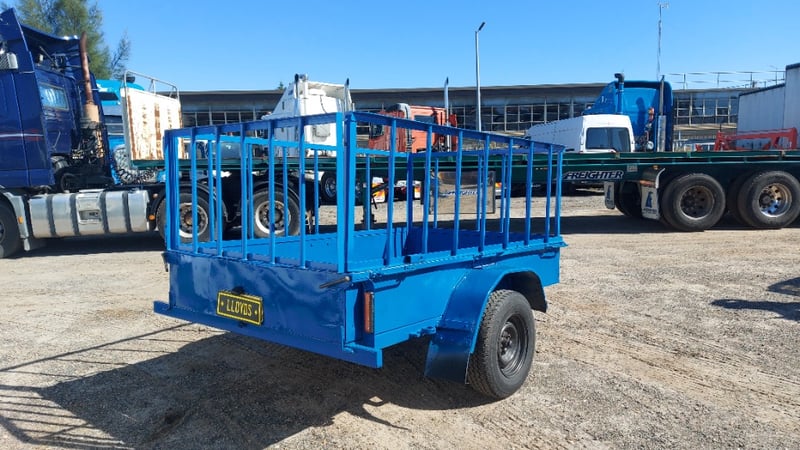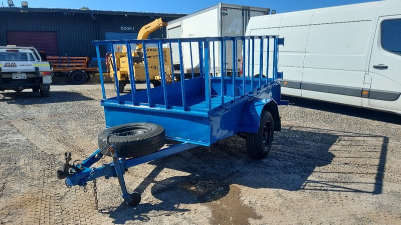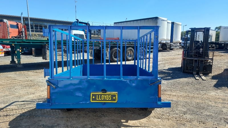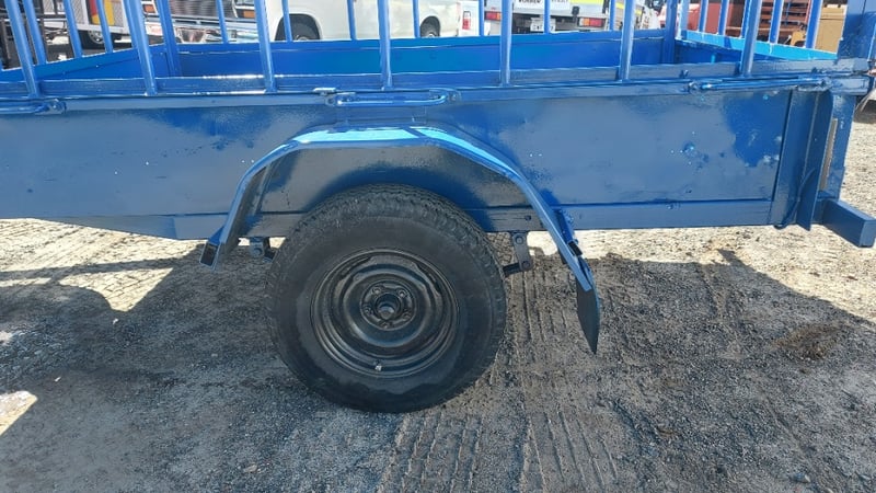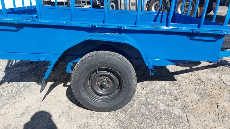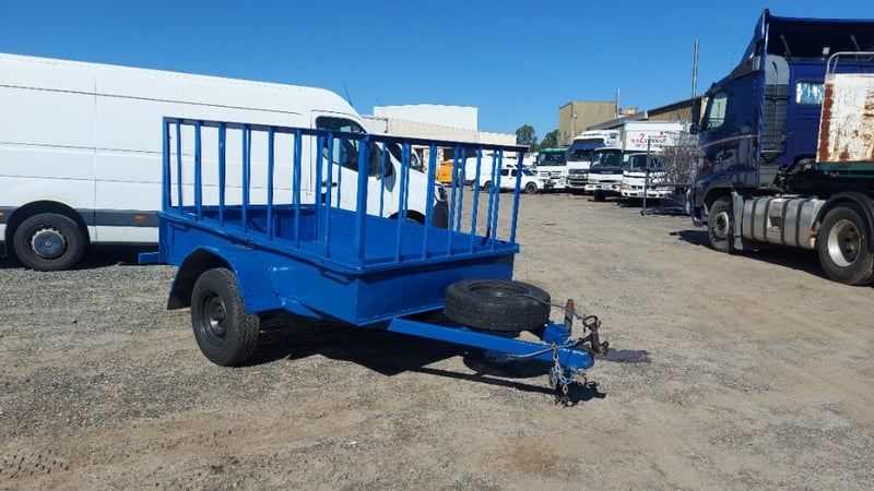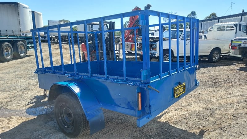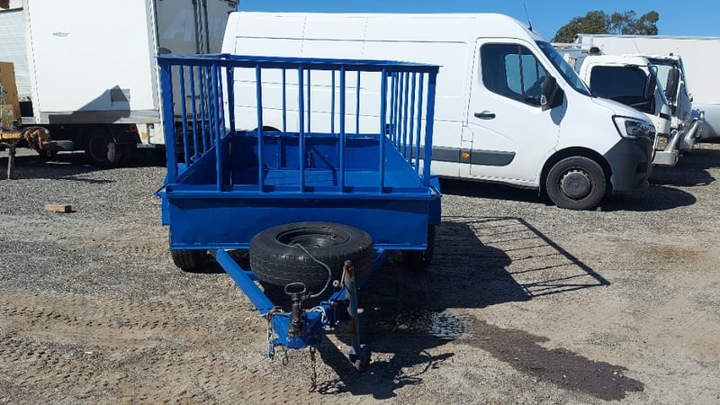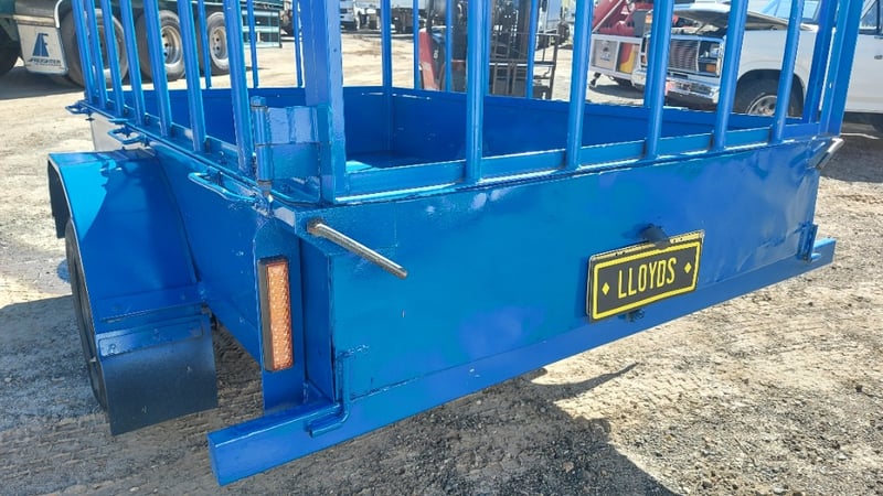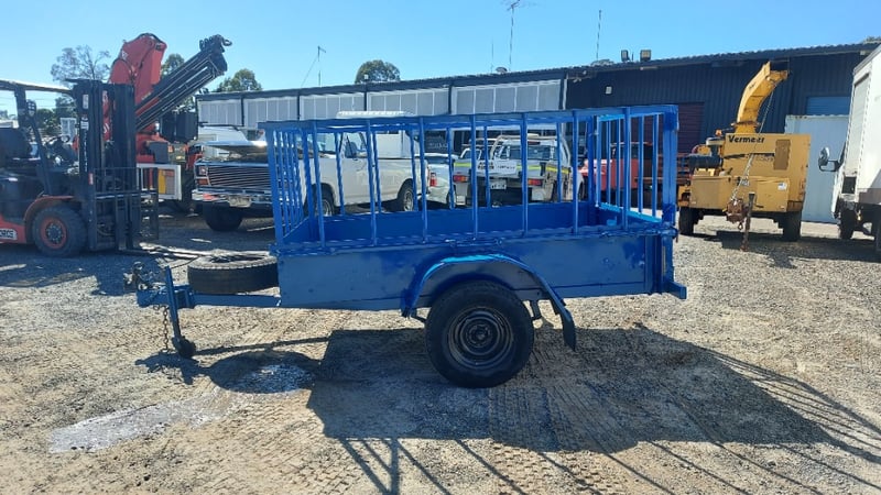 1988 Homemade box trailer, painted blue steel, single axle, 6’ x 4’, fabricated cage with hinged rear gate, spare tyre, jockey wheel, 50mm dia. ball hitch, ATM: 750kg, NSW Reg. N-21530, Expired: 13/03/26, VIN: ends with 8607 (Service NSW registration check)